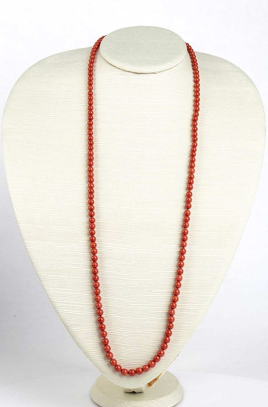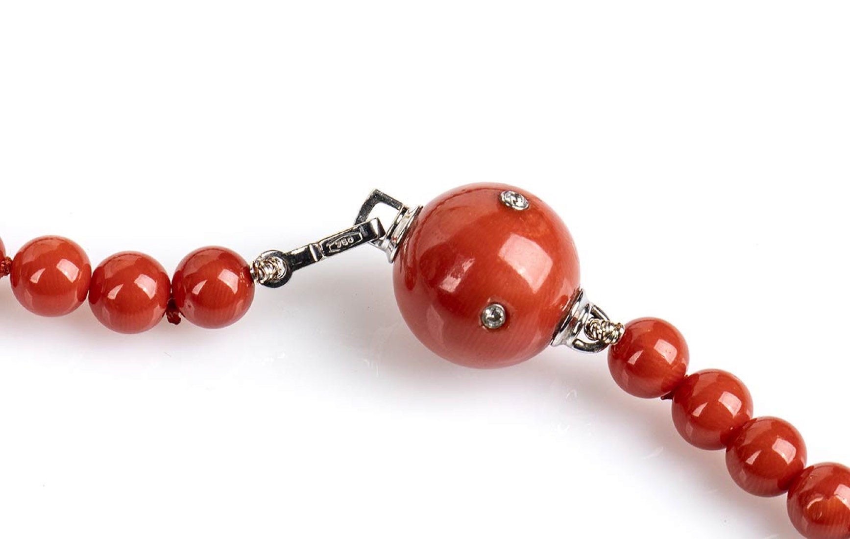 ad un filo di sfere di corallo Mediterraneo (corallium rubrum), chiusura in oro bianco 18k decorata con diamanti taglio brillante 0,04 ct, G, VS. Diametro corallo 6-6,5 mm. Diametro sfera centrale 12,5-13 mm. Punzonata "750". Lunghezza 82 cm. Peso 51,8 gr. Stato di conservazione: ***** eccellente.