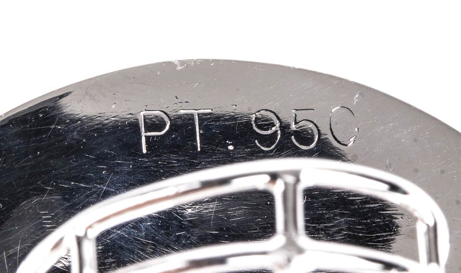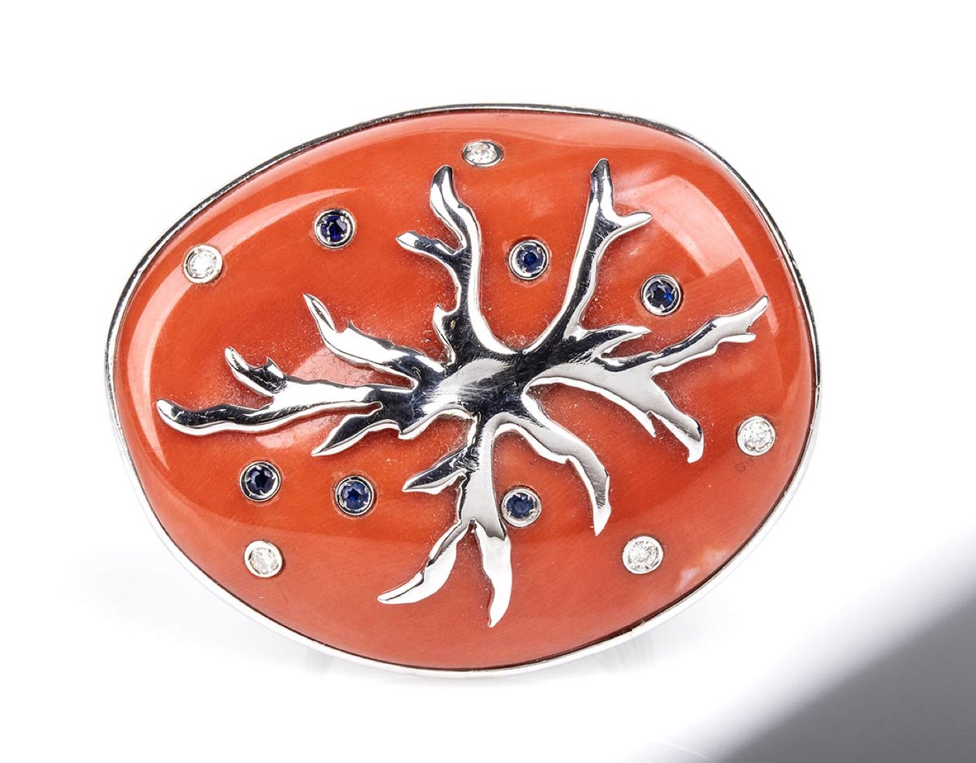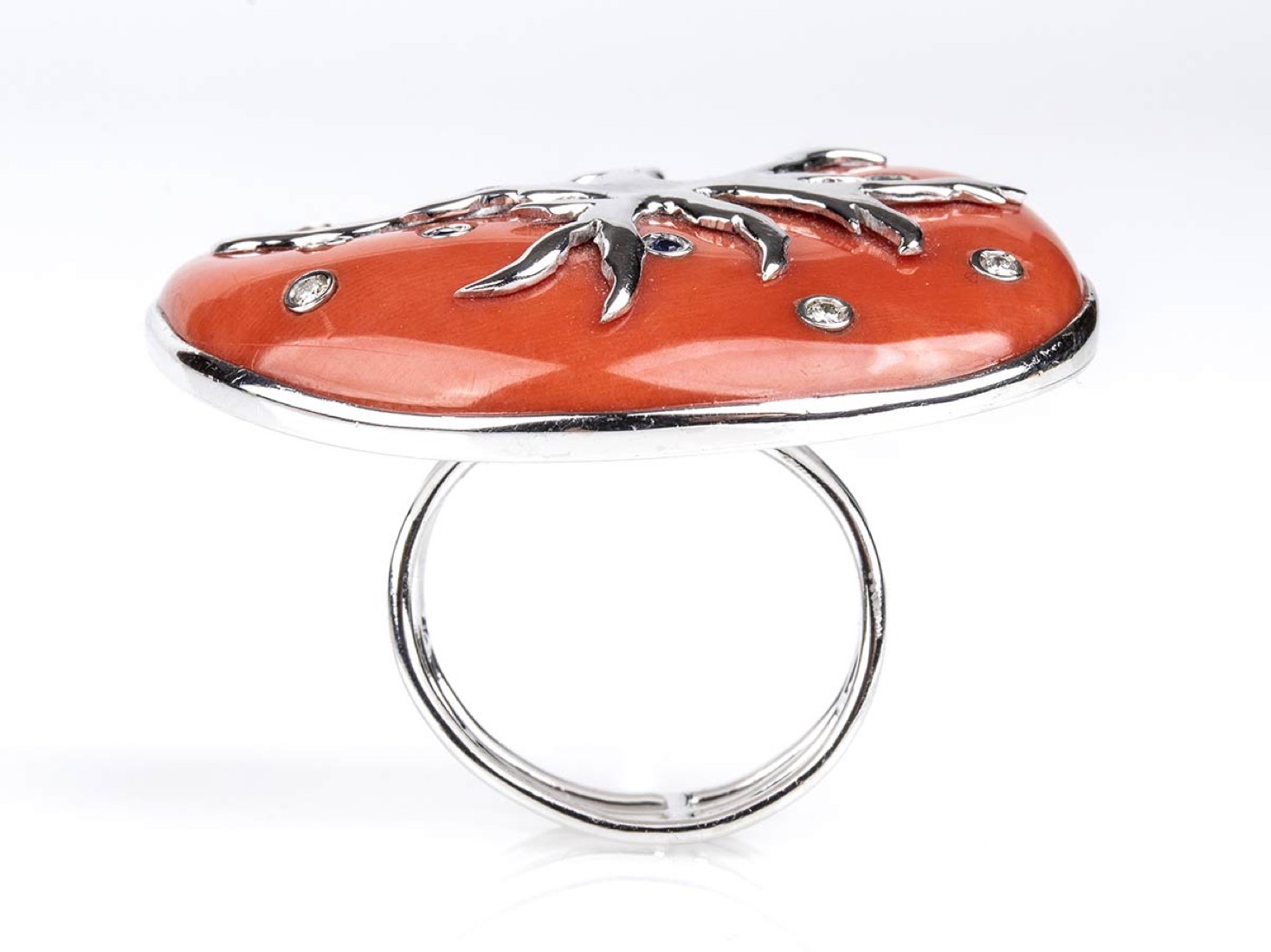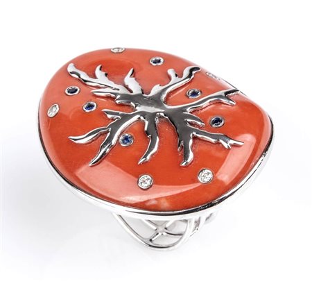 platino 950, incastonato con corallo Cerasuolo (corallium elatius) punteggiato da diamanti e zaffiri. Diamanti taglio brillante 0,10 ct circa, G, VS. Zaffiri 0,15 ct circa. Punzonato "PT 950". Dimensioni fronte 40 x 35 mm. Peso 29,7 gr. Misura IT 12 - Misura US 6. Stato di conservazione: ***** eccellente.