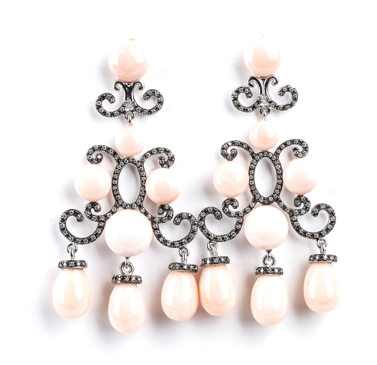 oro bianco 18k, motivo "chandelier" con gocce di corallo rosa (corallium secundum) e nastri in diamanti taglio brillante 1,80 ct circa totali, H, VS. Punzonati "750". Dimensioni 70 x 35 mm. Peso 35 gr. Stato di conservazione: ***** eccellente.