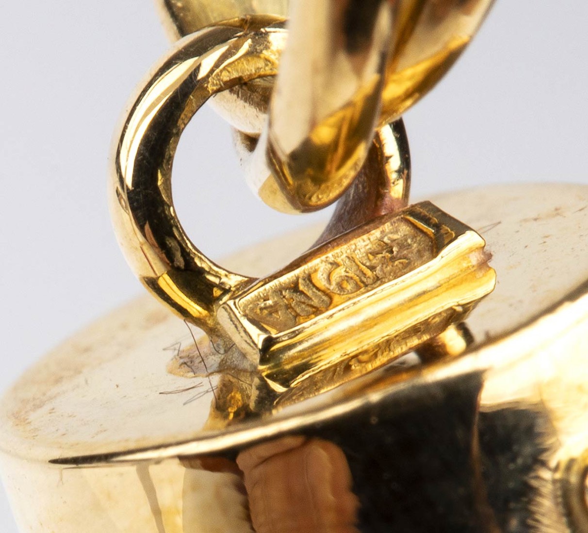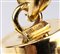 oro giallo 18k, incastonato con piccolo ramo di corallo Mediterraneo (corallium rubrum). Punzonato "750". Dimensioni 90 x 75 mm. Peso 12,4 gr. Stato di conservazione: ***** eccellente.