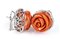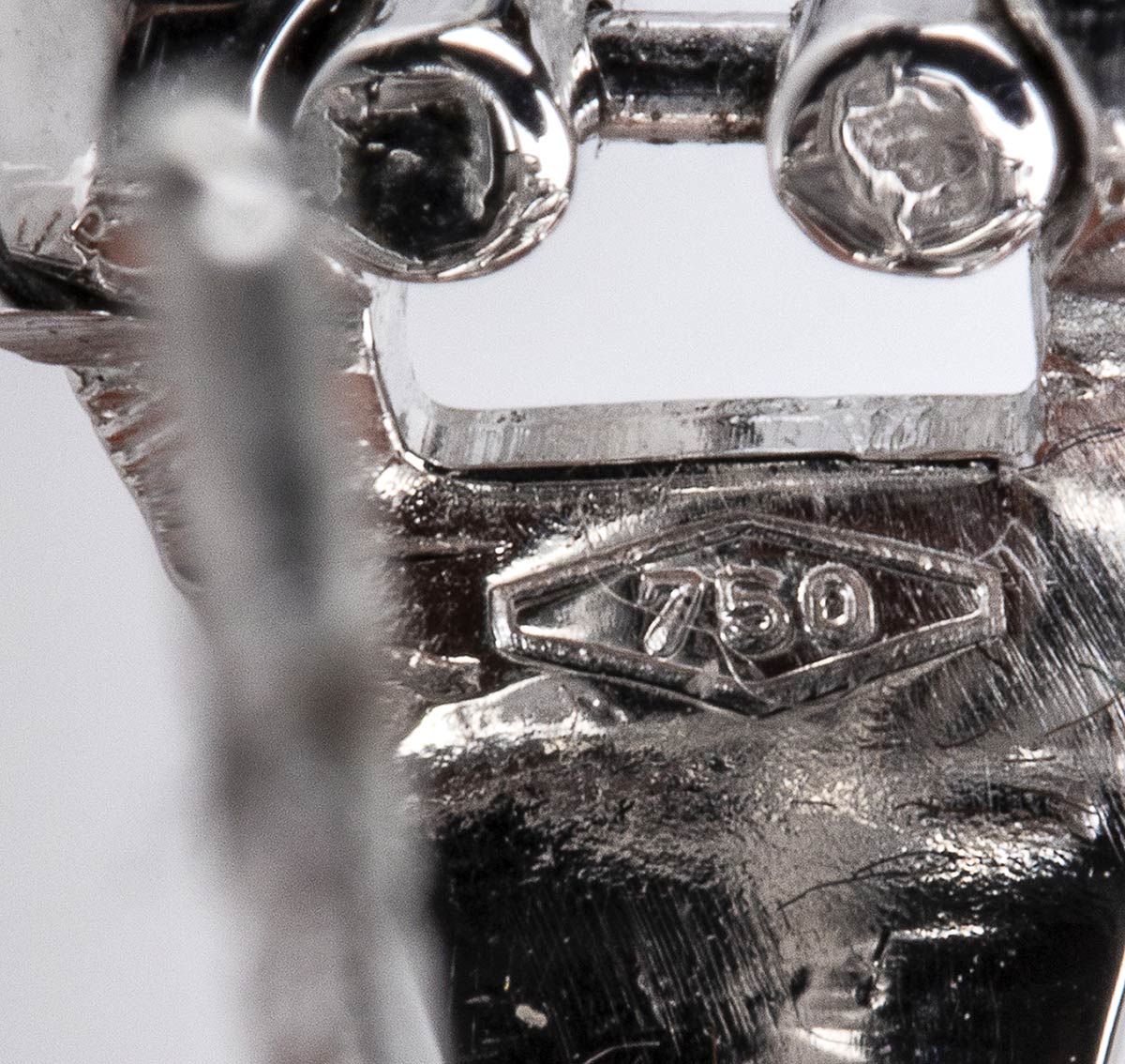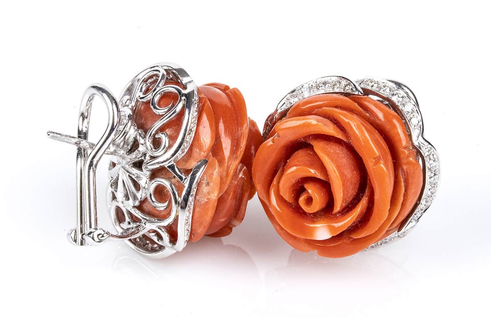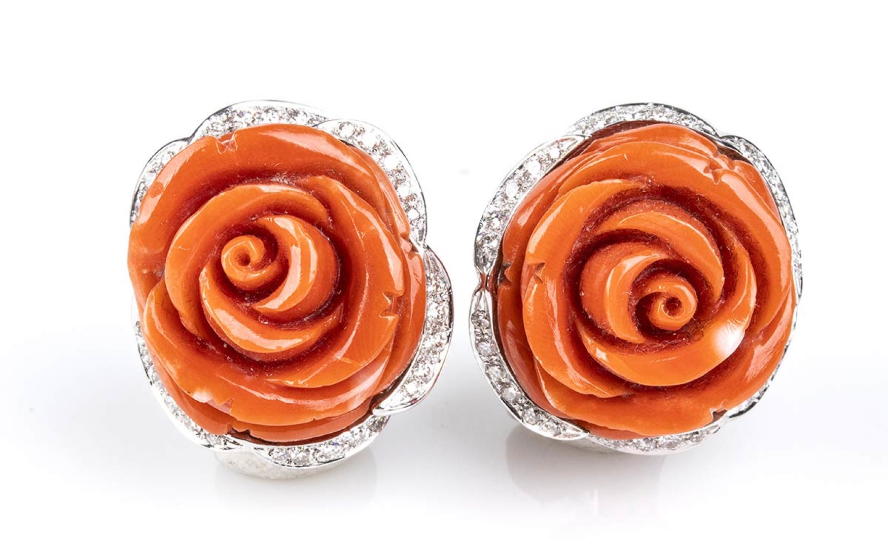 oro bianco 18k, incastonato con fiore scolpito in corallo Cerasuolo (corallium elatius), dettagli in diamanti taglio brillante 0,74 ct circa, G, VVS-VS. Punzonati "750" e "307 NA". Diametro 22 mm. Peso 22,7 gr. Stato di conservazione: ***** eccellente.