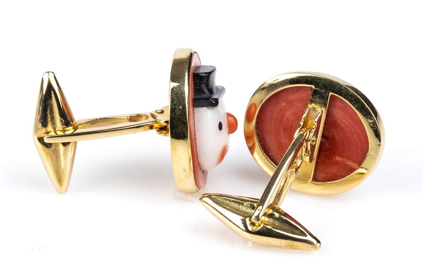 oro giallo 18k, ciascuno di forma rotonda, raffigurante una testa di pupazzzo di neve in onice e con corallo Cerasuolo (corallium elatius). Punzonati "750". Dimensioni fronte 20 x 25 mm. Peso 12,8 gr. Stato di conservazione: ***** eccellente.
