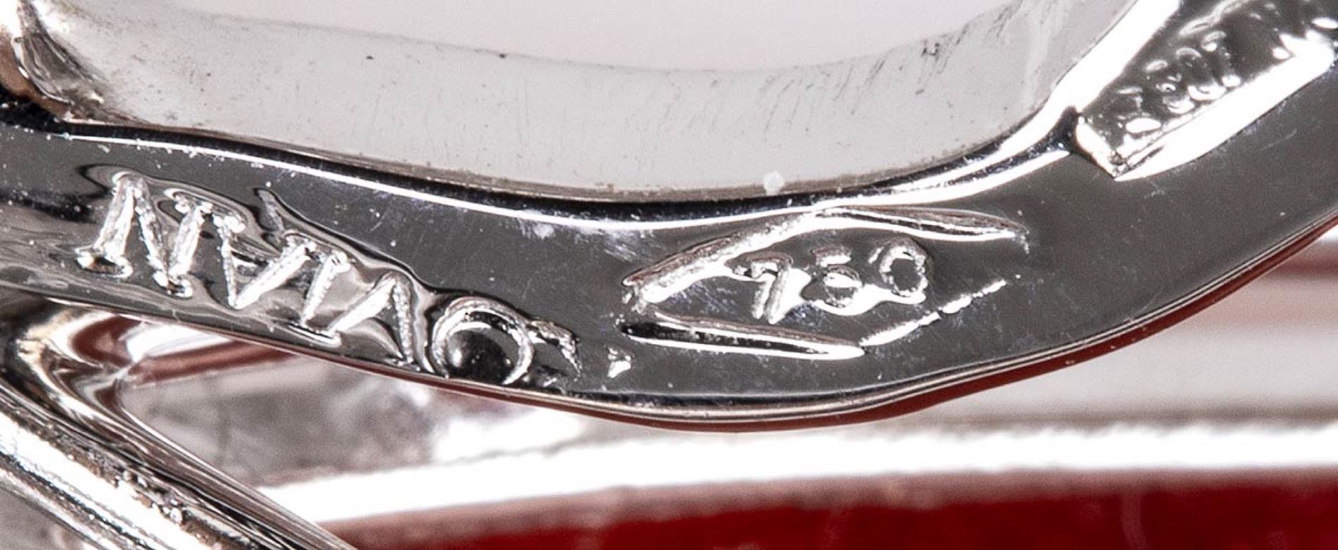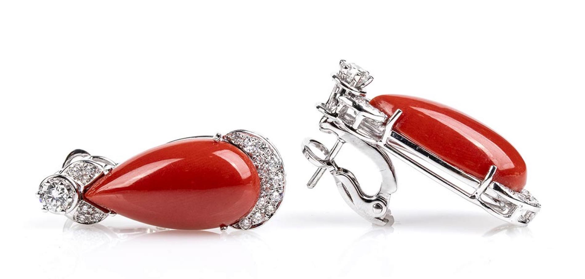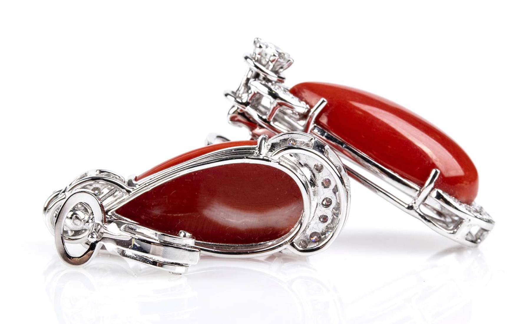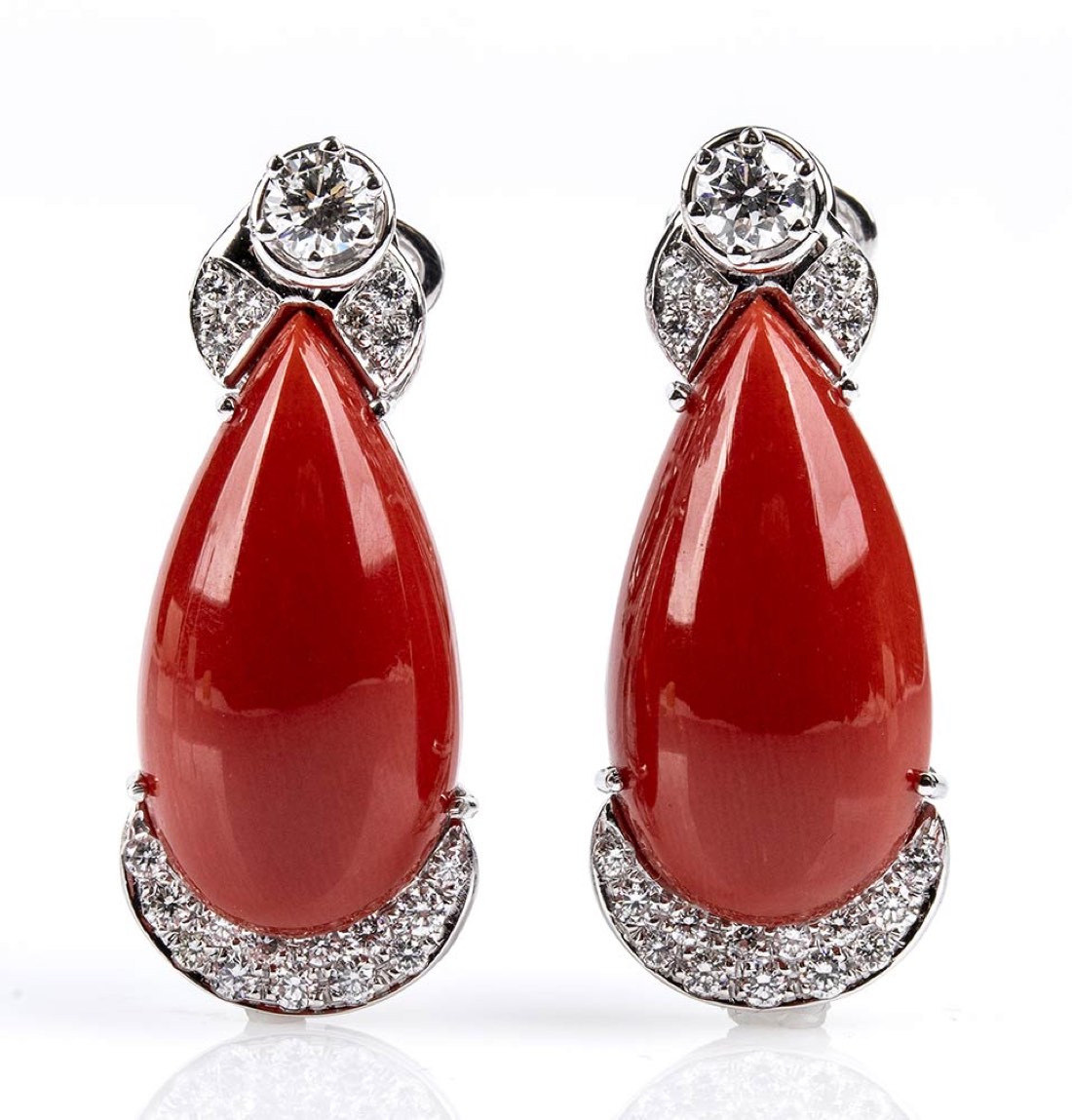 oro bianco 18k incastonati con goccia in corallo Cerasuolo (corallium elatius) contornata da moissanite per complessivi 0,80 ct circa. Punzonati "750" e "Rovian". Dimensioni 30 x 8 mm. Peso 11,7 gr. Stato di conservazione: ***** eccellente.