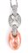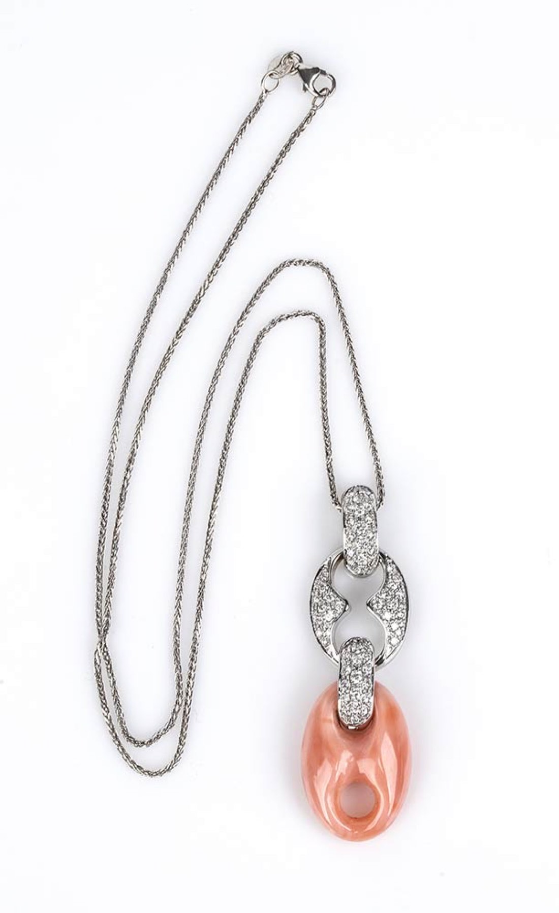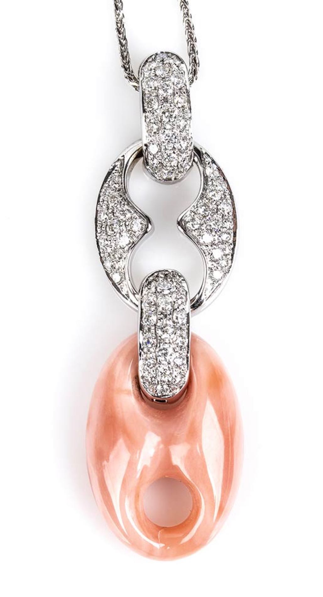 oro bianco 18k, pendente in corallo Cerasuolo (corallium elatius) sormontato da pavé di diamanti taglio brillante 1,01 ct circa, G, VVS-VS. Punzonato: "750", "1380 AR". Lunghezza pendente 50 mm. Lunghezza catenina 44 cm. Peso 11,9 gr. Stato di conservazione: ***** eccellente.