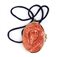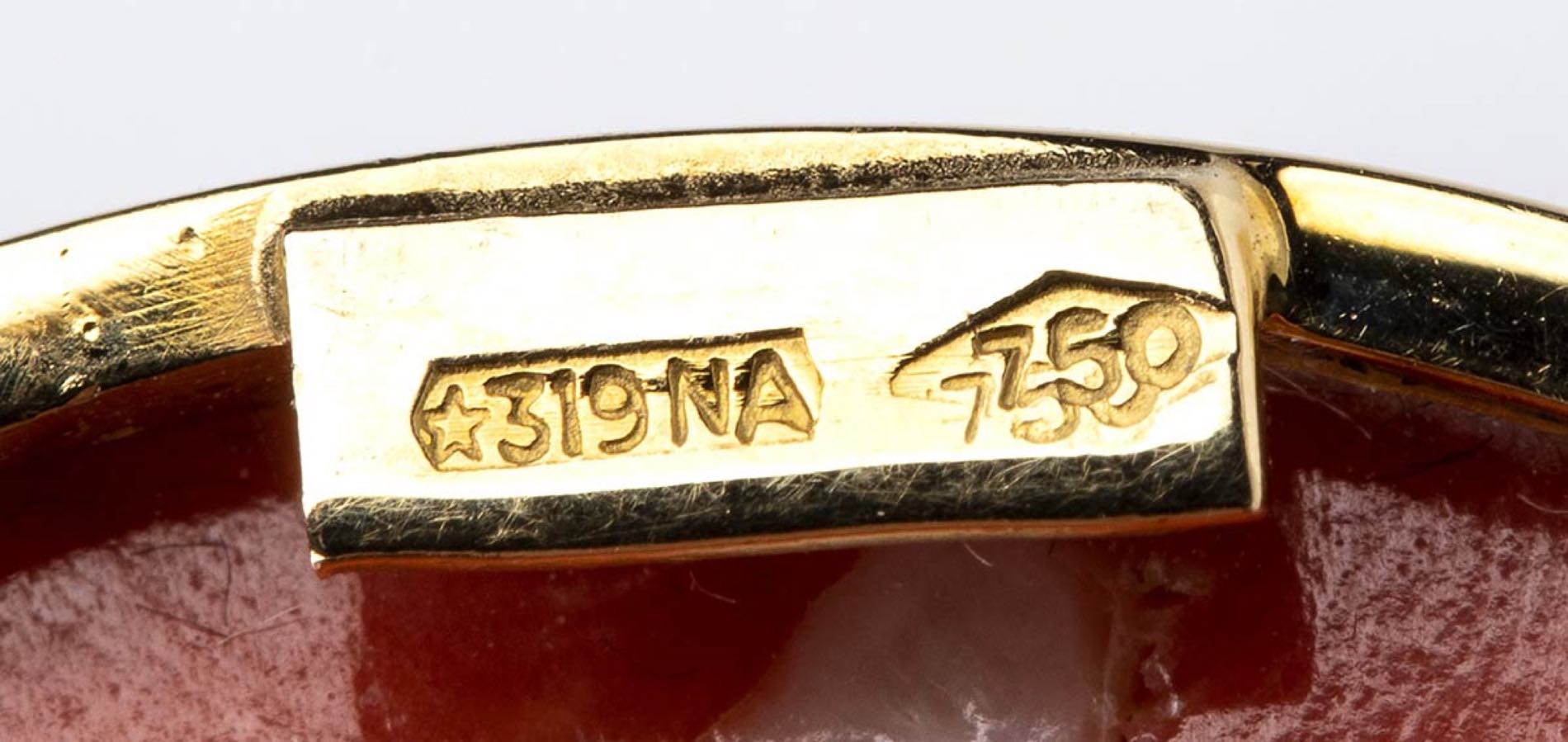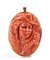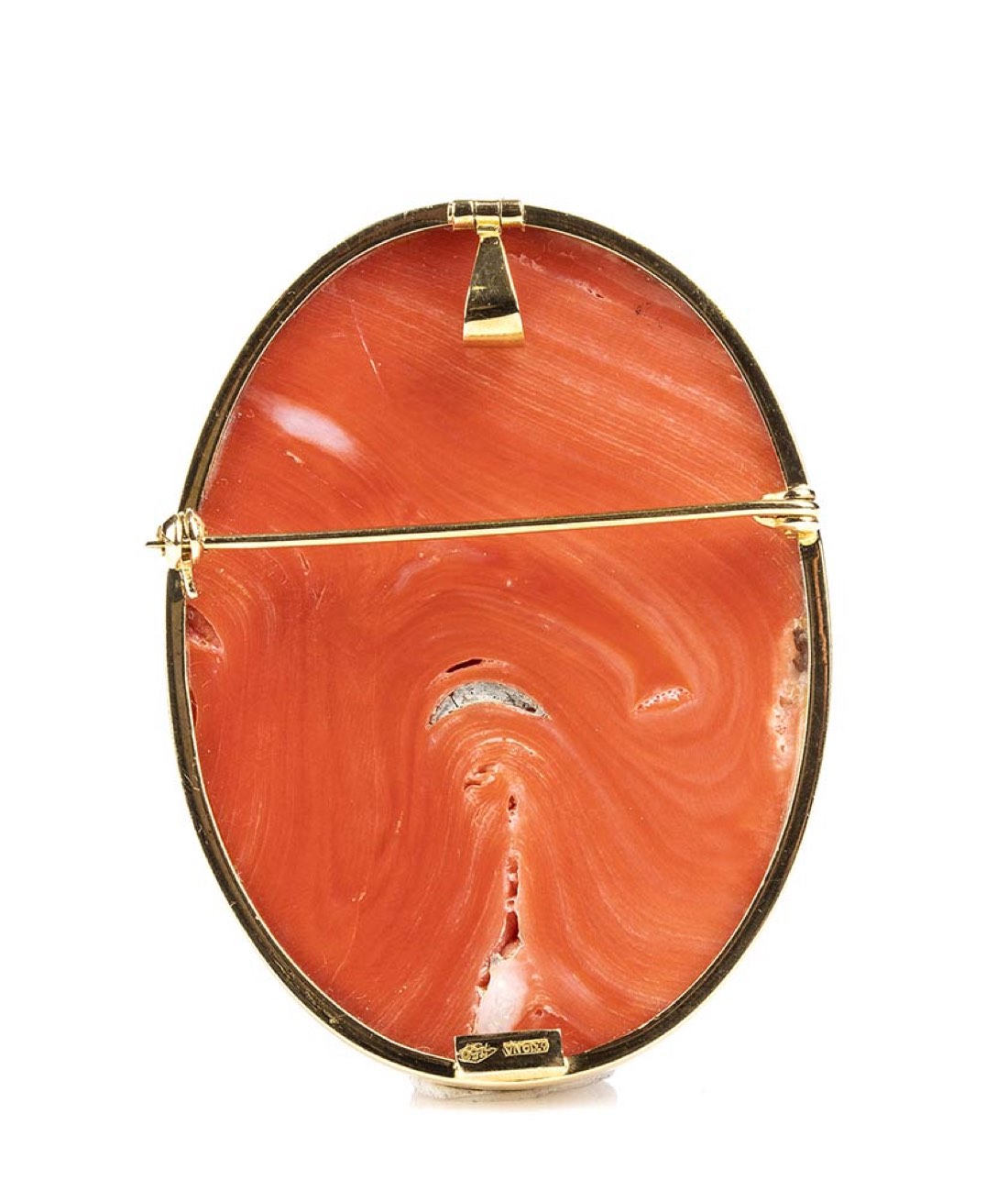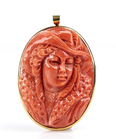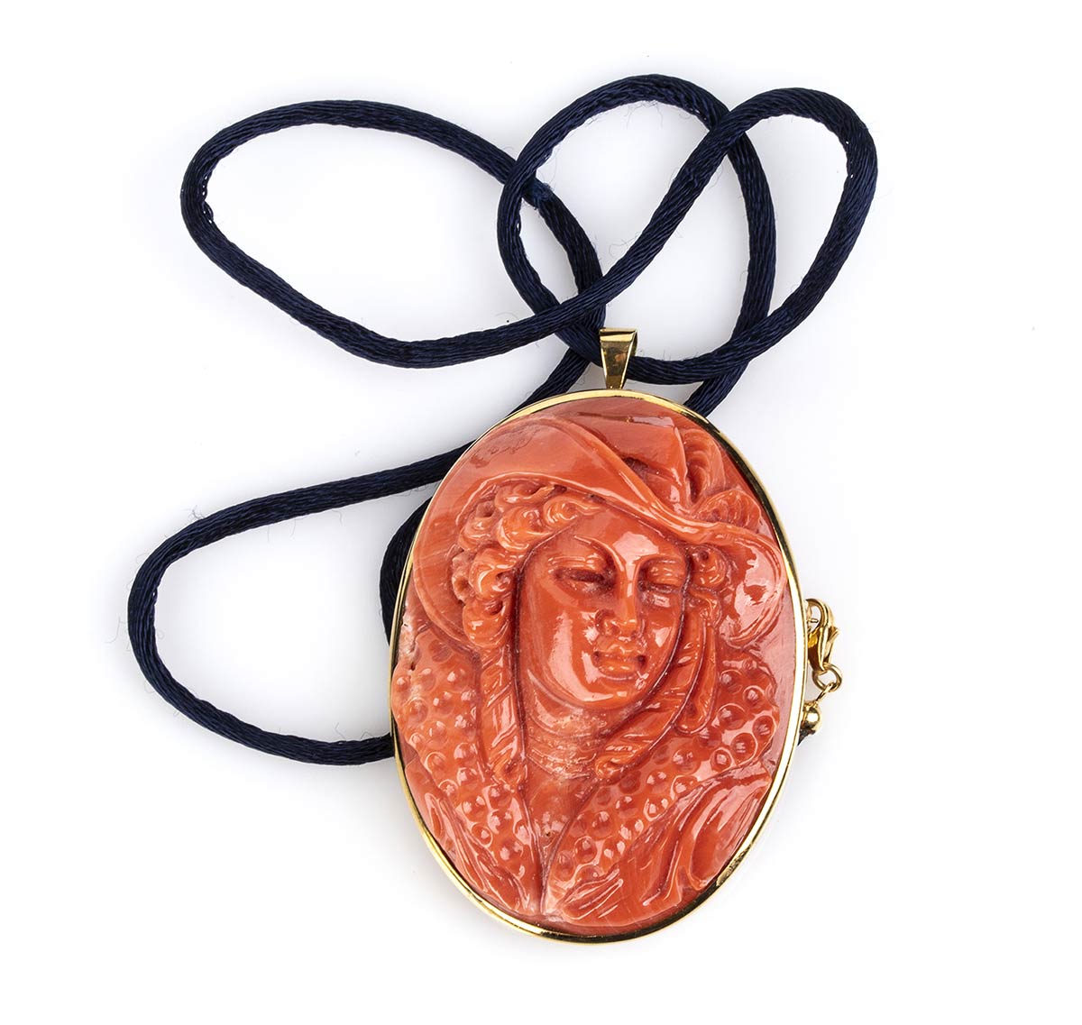 oro giallo 18k, laccio in tessuto a cordonetto a cui è sospeso un pendente-spilla incastonato con cammeo scolpito in corallo Cerasuolo (corallium elatius) raffigurante un volto femminile con copricapo. Punzonato "750" e "319 NA". Dimensioni 48 x 35 mm. Peso 36 gr. Stato di conservazione: ***** eccellente.