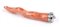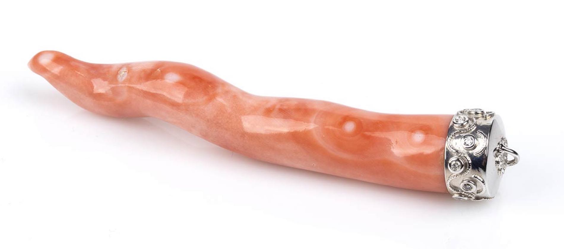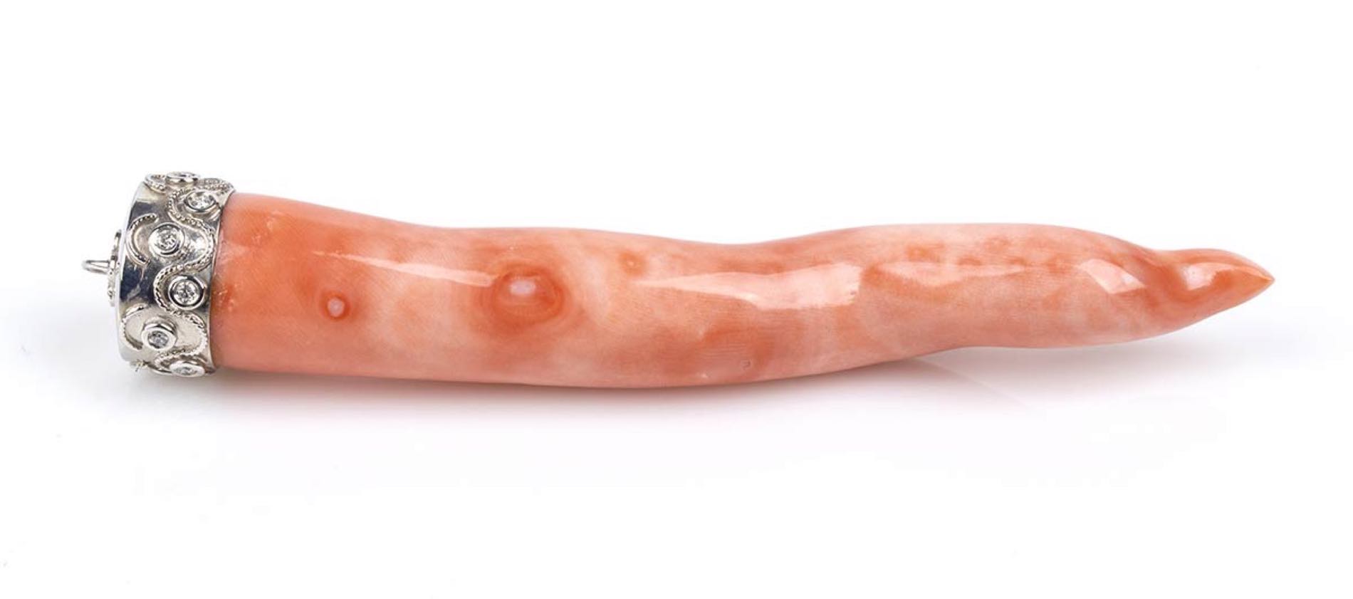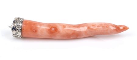 oro bianco 18k, con piccolo corno in corallo Cerasuolo (corallium elatius) e diamanti taglio brillante 0,30 ct circa, G VVS-VS. Lunghezza 100 mm. Largezza 15 mm. Peso 32,5 gr. Stato di conservazione: ***** eccellente.