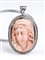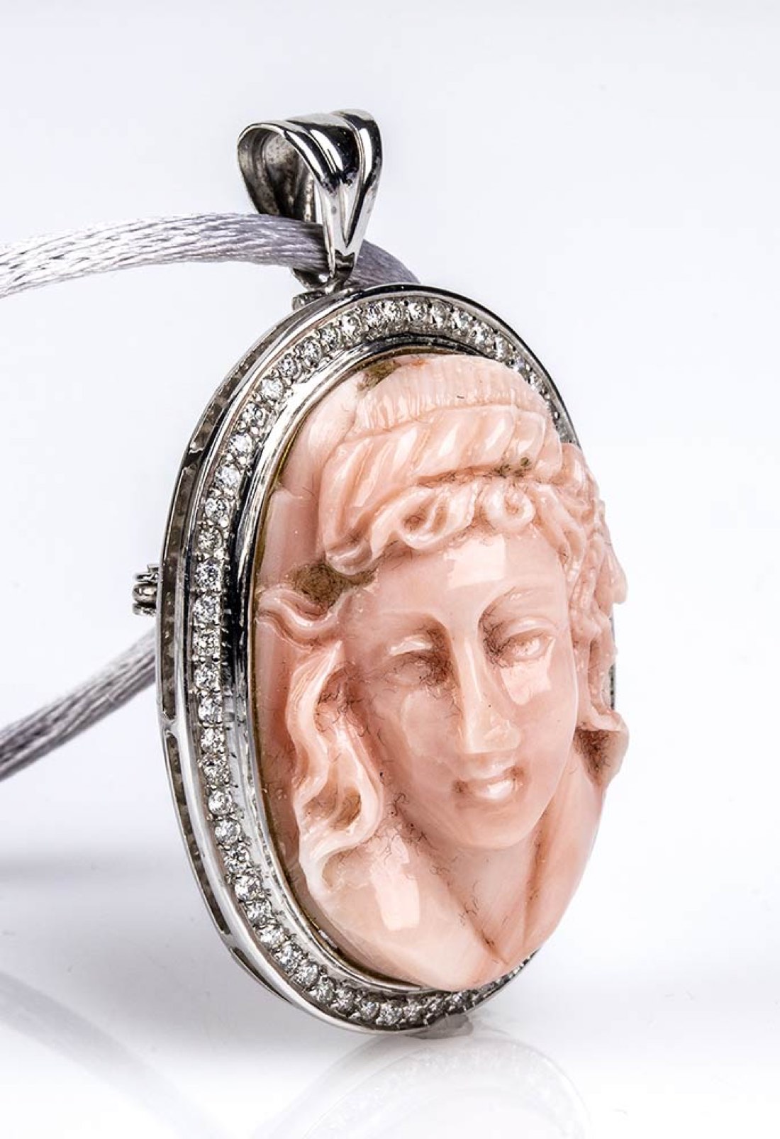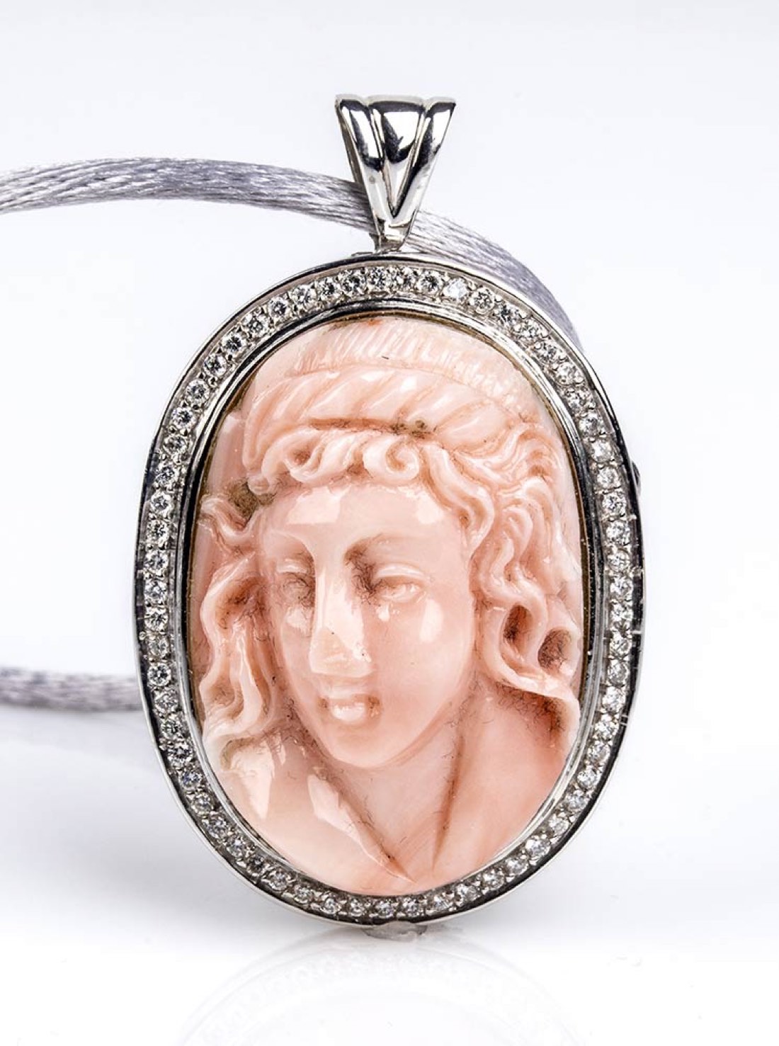oro bianco 18k, di forma ovale, incastonata con cammeo scolpito in corallo Cerasuolo (corallium elatius) raffigurante un profilo femminile con capelli mossi con cornice in diamanti taglio brillante 0,62 ct circa, G, VVS-VS. Punzonato "750". Dimensioni 40 x 25 mm. Peso totale 14,2 gr. Stato di conservazione: ***** eccellente.