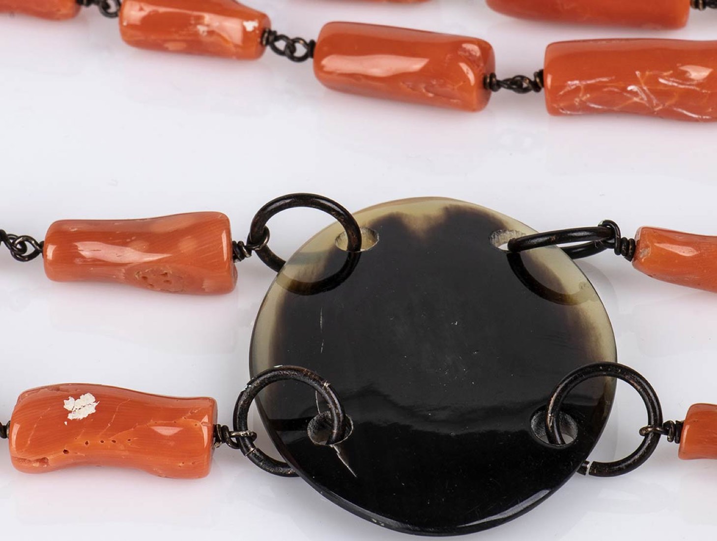 montatura in argento 925/1000, a due fili di cilindretti di corallo Cerasuolo (corallium elatius) con elemento centrale in corno. Lunghezza 80 cm, diametro corallo 7,5 mm, elemento centrale in corno 38 x 51 mm. Peso 109,4 gr. Stato di conservazione: ***** eccellente.