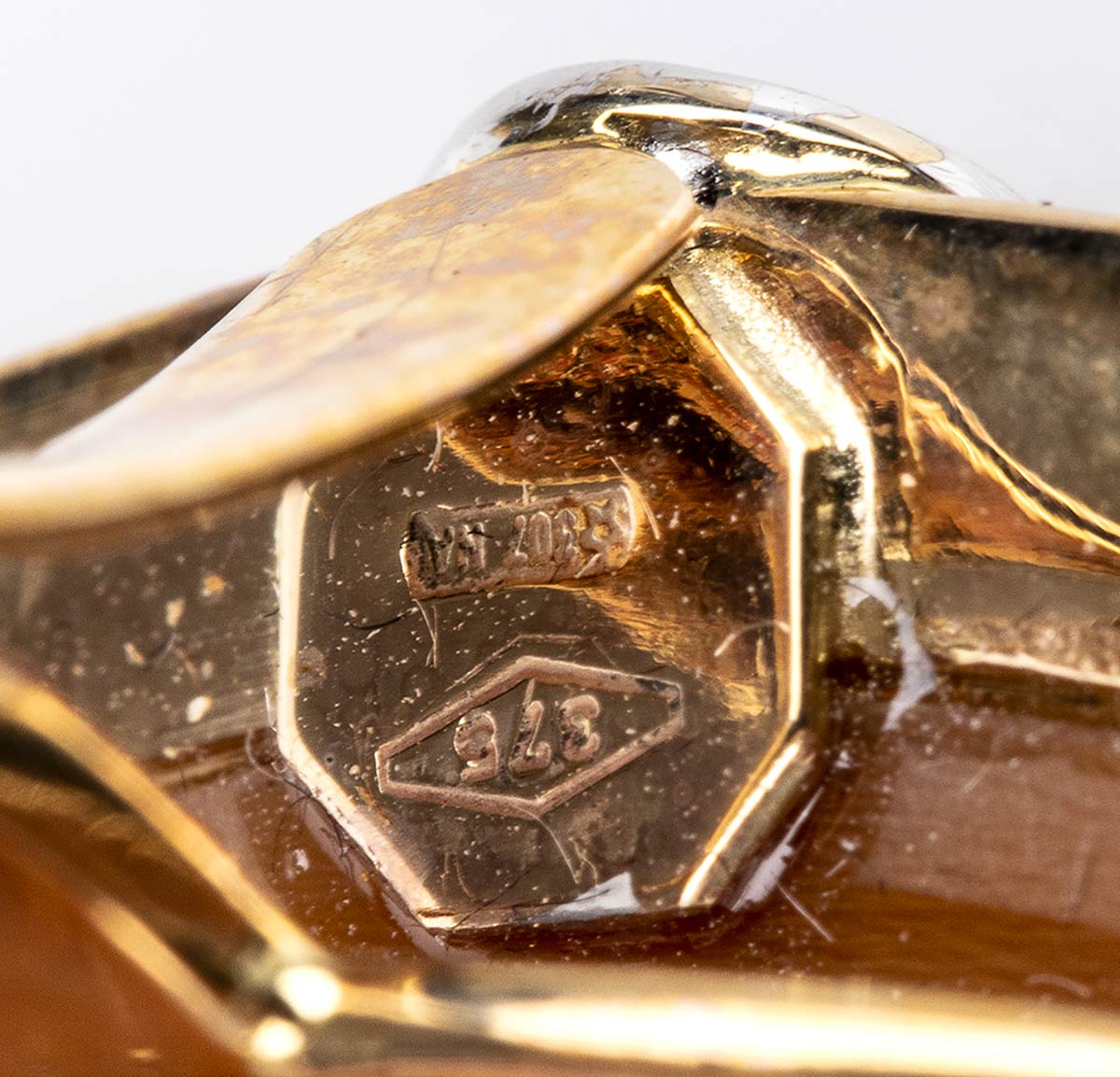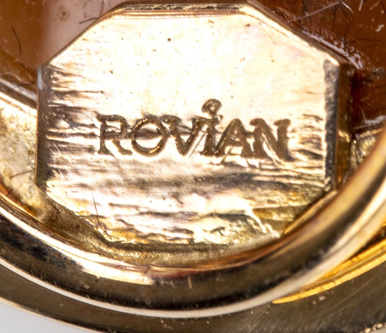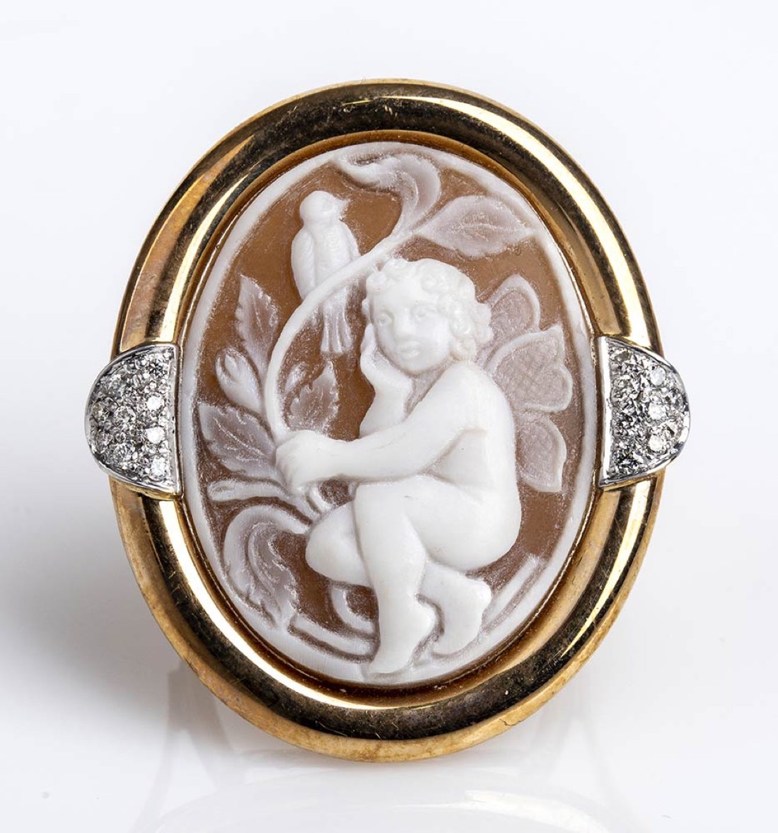 oro giallo ed oro bianco 18k, incastonato con cammeo scolpito su conchiglia sardonice raffigurante un amorino con volatile, dettagli in diamantio taglio brillante 0,12 ct circa, G, VS. Firmato "ROVIAN" e punzonato "750". Dimensioni fronte 35 x 25 mm. Peso 14,9 gr. Stato di conservazione: ***** eccellente.