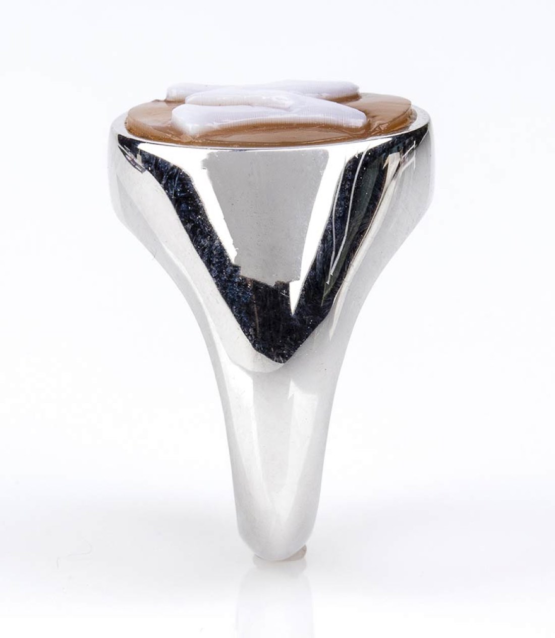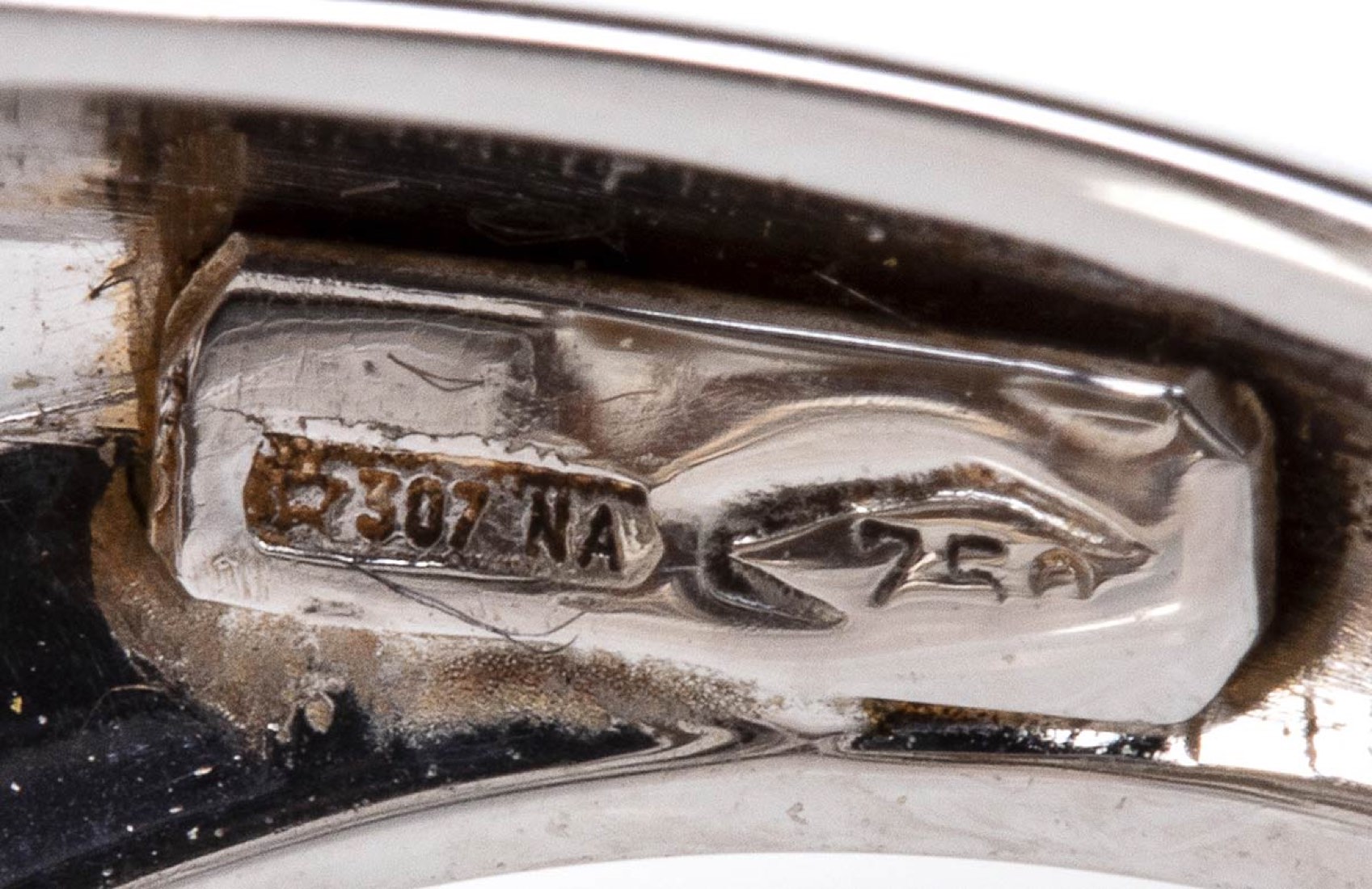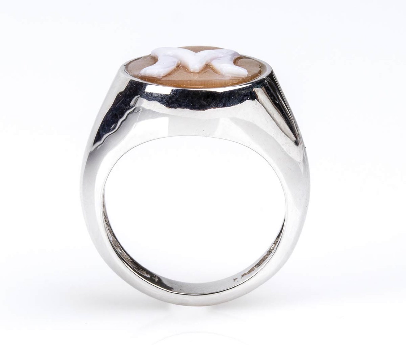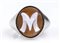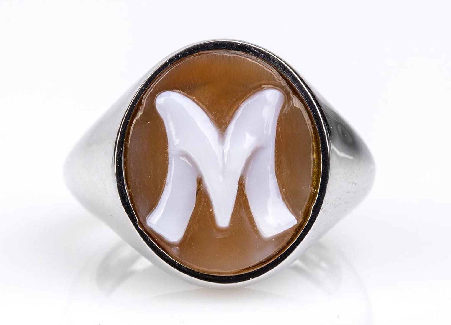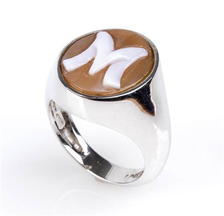 oro bianco 18k, incastonato con cammeo scolpito su conchiglia sardonica raffigurante la lettera "M". Punzonato "750"" e "307 NA". Dimensioni fronte 20 x 15 mm. Peso 6,2 gr. Stato di conservazione: ***** eccellente.