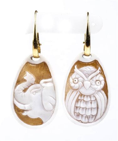 oro giallo 18k, incastonati con cammeo scolpito su conchiglia sardonica raffigurante un gufo ed un elefante. Punzonati "750" e "307 NA". Dimensioni 60 x 25 mm. Peso 7,2 gr. Stato di conservazione: ***** eccellente.