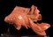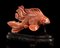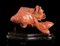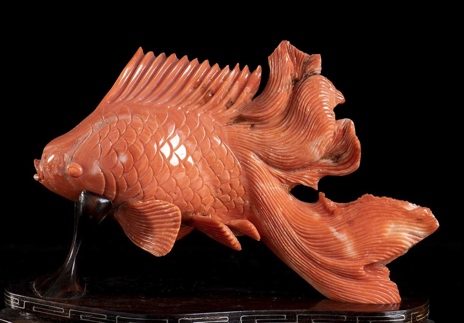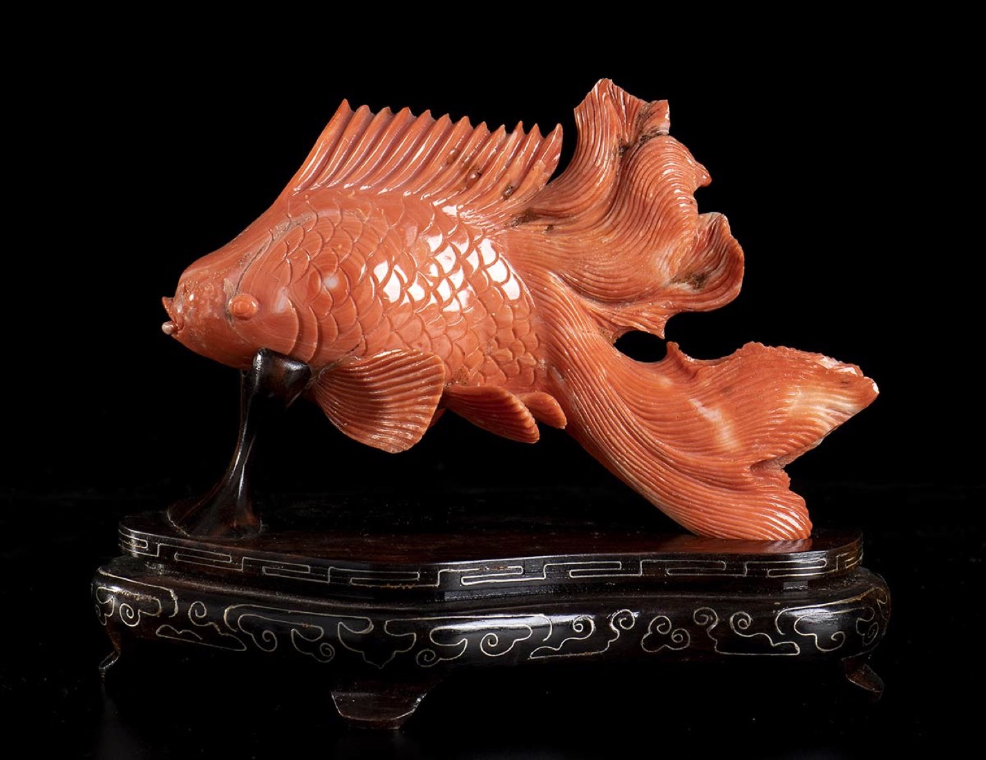 (corallium elatius) raffigurante un pesce posto su una base lignea. Dimensioni scultura 7 x 13 x 6,2 cm, base 30 x 15,3 x 7,4 cm. Peso scultura 204,5 gr. Stato di conservazione: **** buono (difetti).