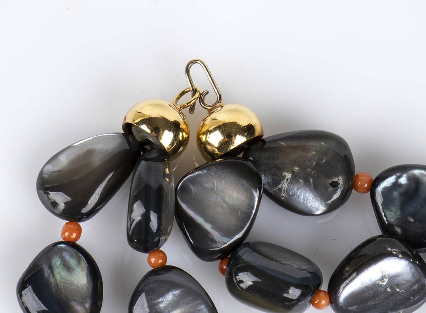 oro giallo 18k, madreperla di Pinctada Fucata e piccole sfere di corallo Mediterraneo (corallium rubrum) disposti in gradazione. Punzonata "750" e "1075 NA". Lunghezza 47 cm. Peso 185,5 gr. Stato di conservazione: ***** eccellente.