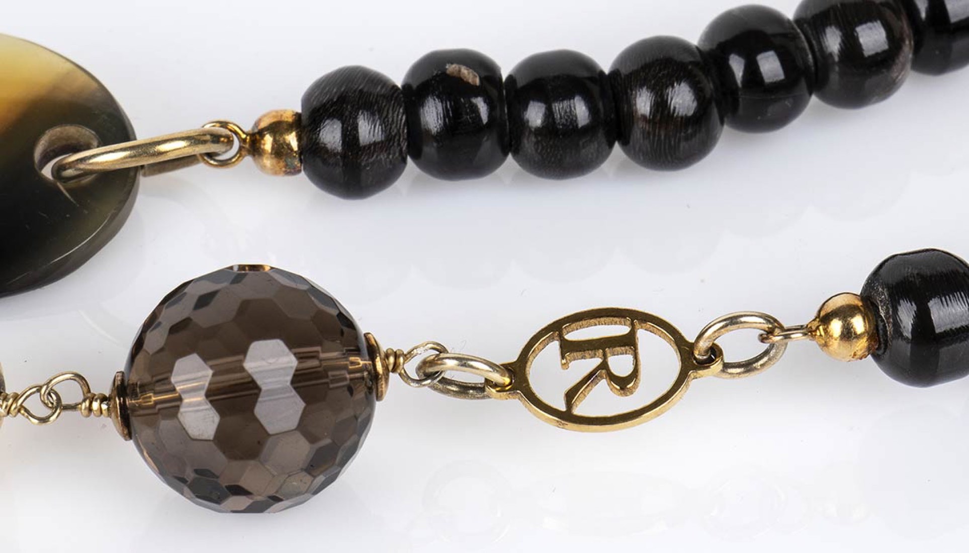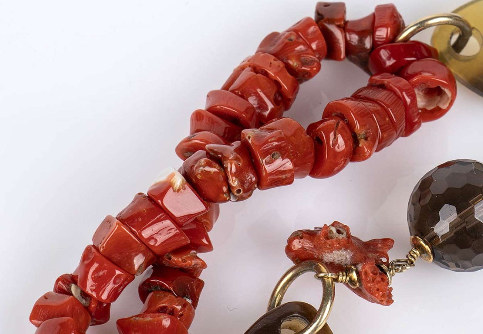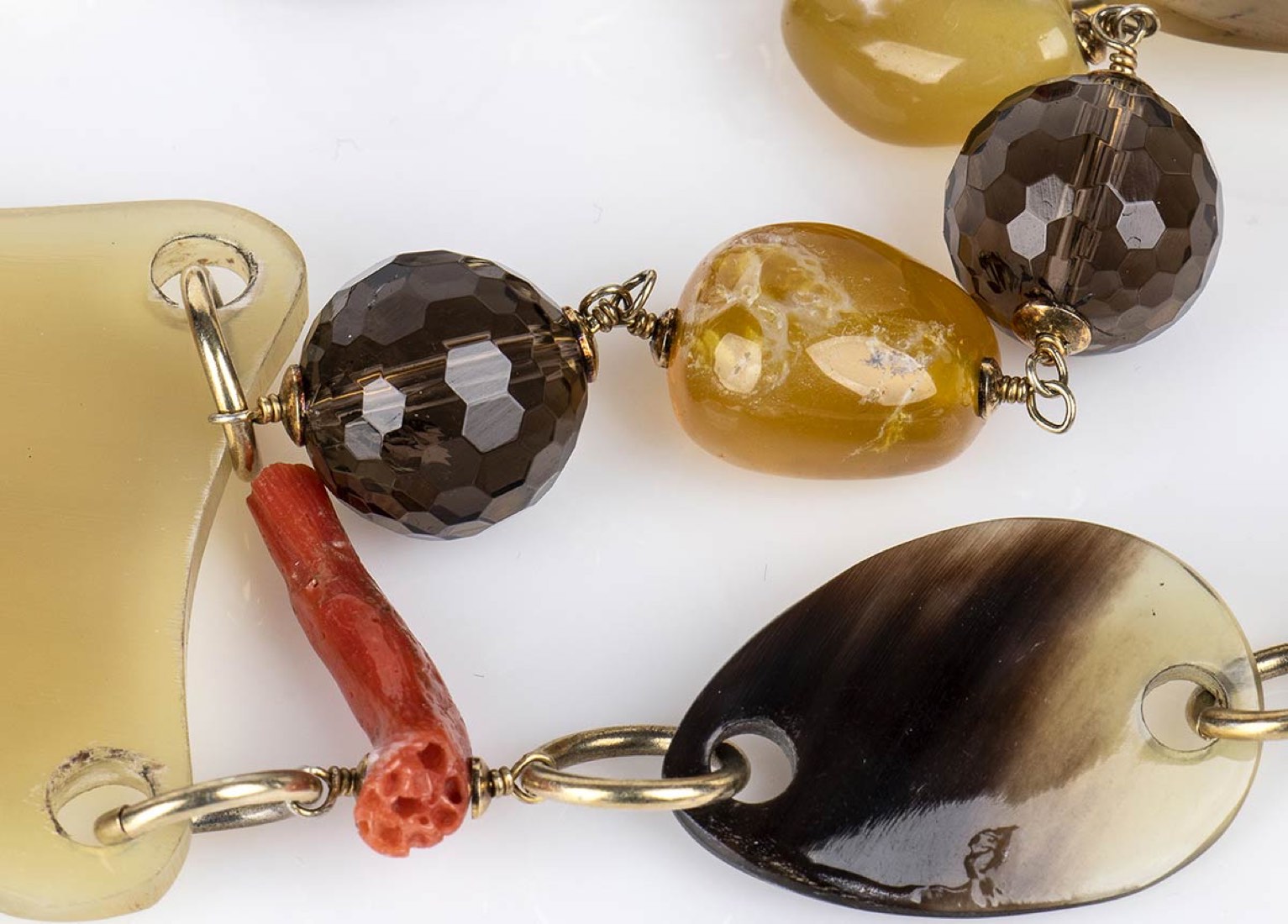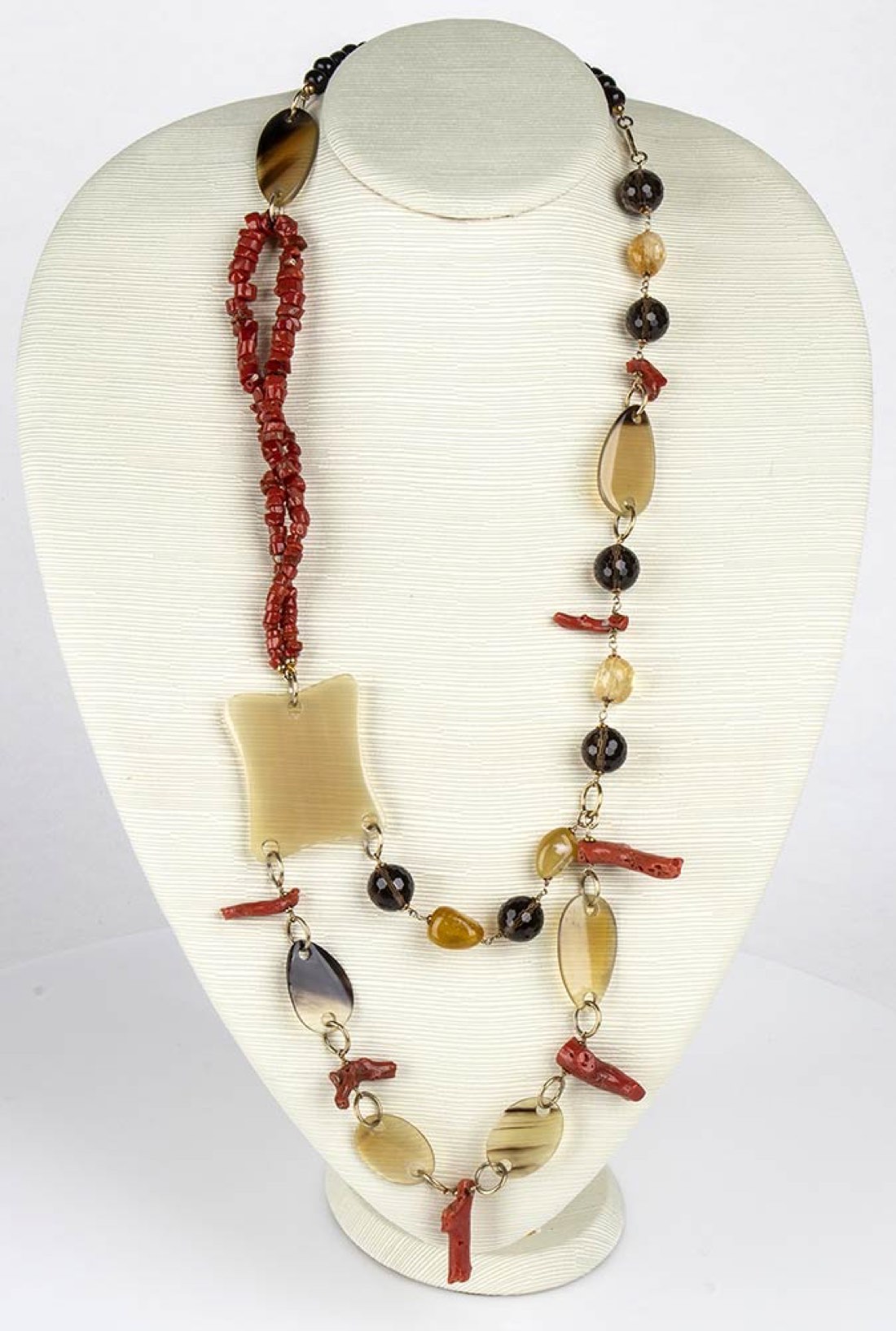 Girocollo con corallo Mediterraneo, corno, quarzo citrino, legno ed argento