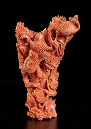 (corallium elatius) raffigurante un ramo con uccelli posto su una base lignea. Dimensioni scultura 8,6 x 5 x 2,8 cm, base 2,1 x 7,8 x 6,3 cm. Peso scultura 85,8 gr. Stato di conservazione: ***** eccellente.