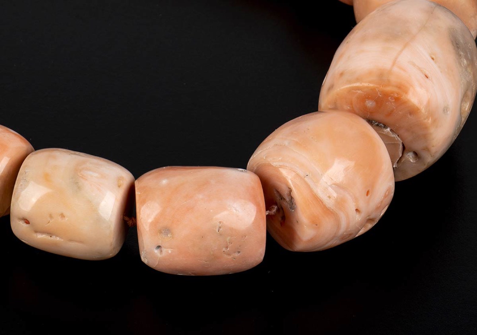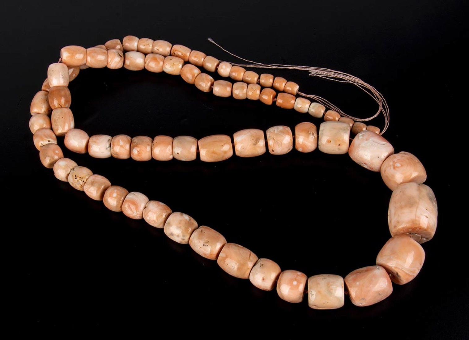 barilotti di corallo rosa (corallium secundum). Lunghezza 105 cm. Dimensioni 10,5-9,5-6,5-5,5 mm. Diametri: 30-27-20-10 mm. Peso totale 464 gr. Stato di conservazione: ***** eccellente.