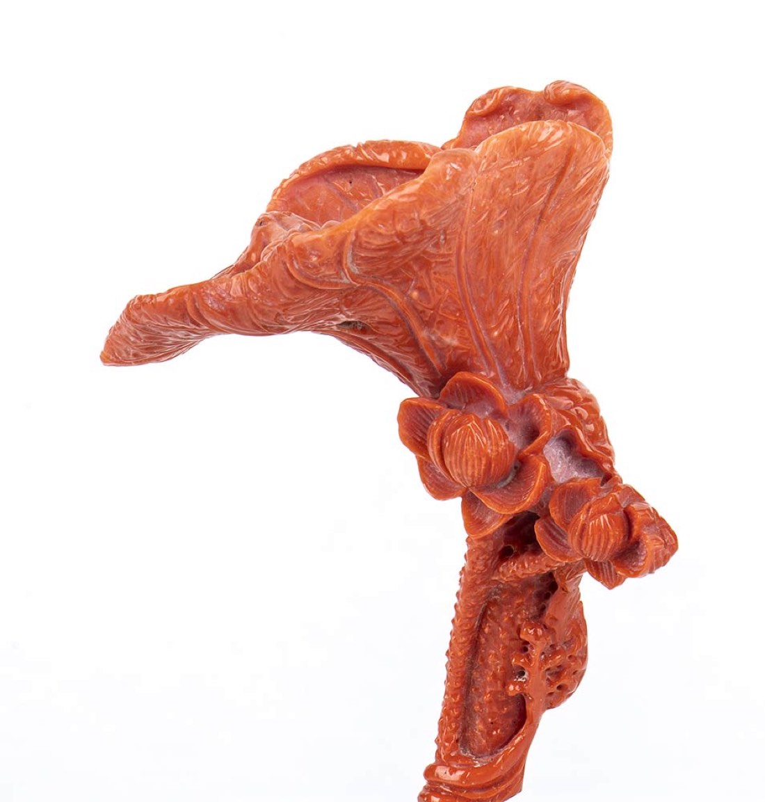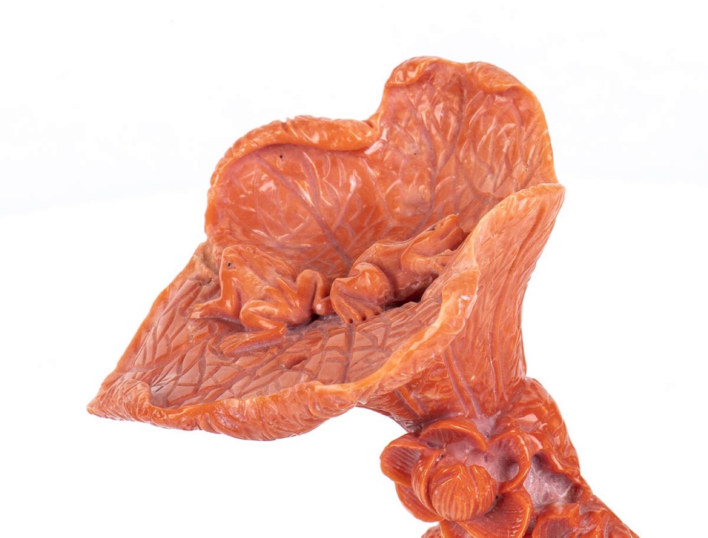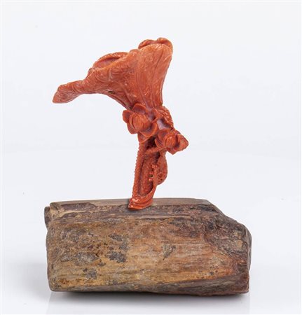 (corallium elatius) raffigurante un fiore con rospi posto su una base in legno fossile. Dimensioni scultura 8,5 x 7,2 x 6,8 cm, base 4,2 x 11 x 8,2 cm. Peso scultura 96,4 gr. Peso base 631,8 gr. Stato di conservazione: ***** eccellente.