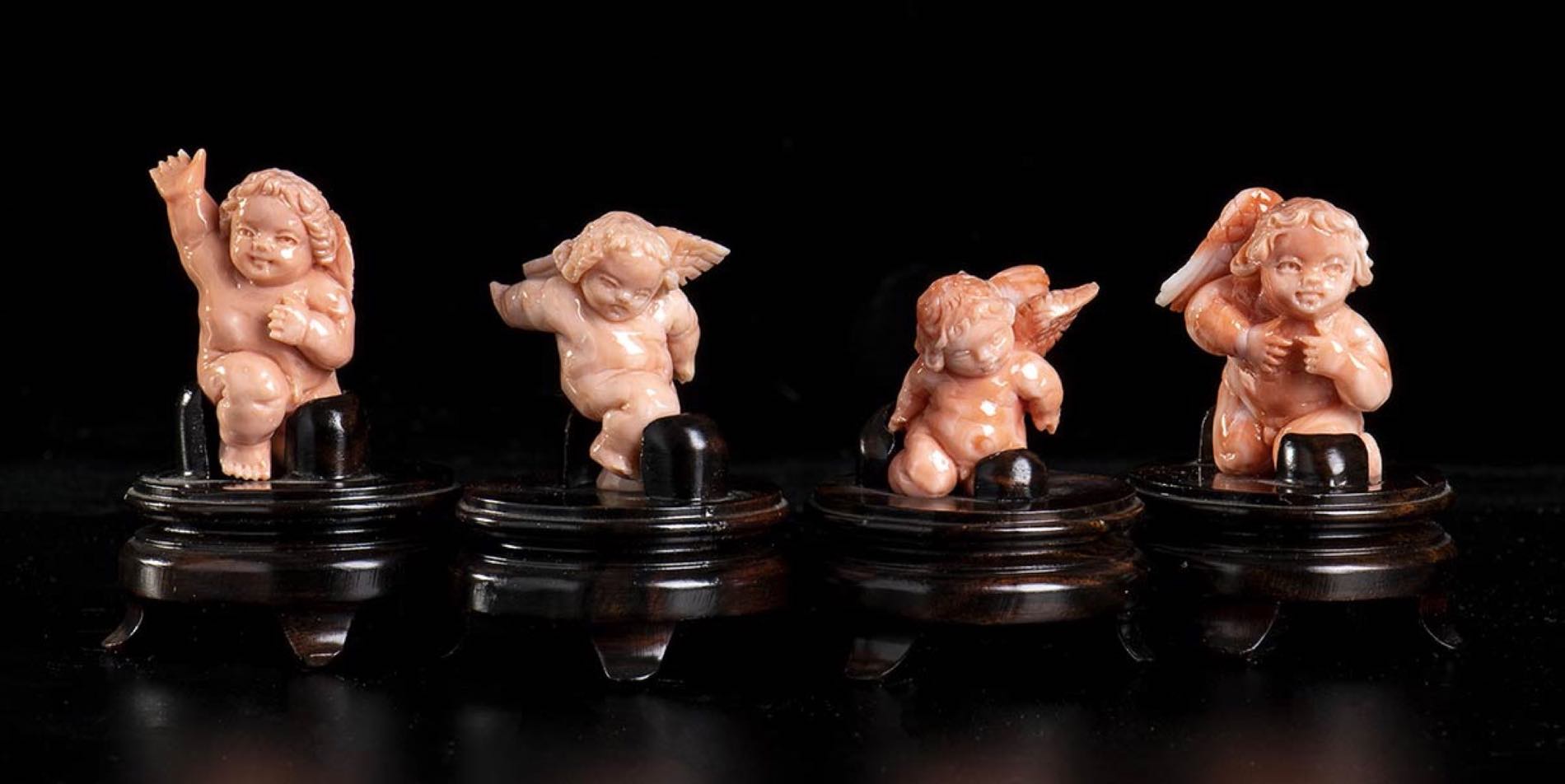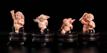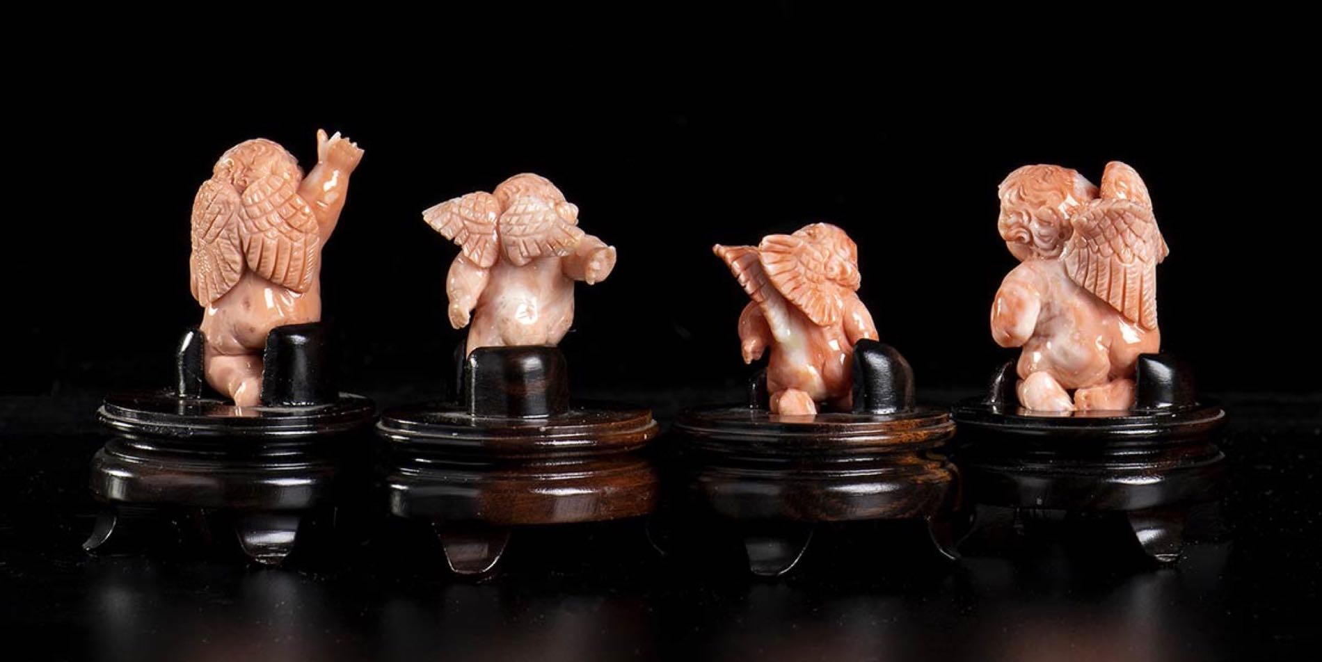 (corallium elatius) raffiguranti quattro putti posti su una base lignea. Dimensioni sculture: 3,3 x 1,7 x 2,7 cm; 4,6 x 2,6 x 2 cm; 4 x 3 x 2 cm; 4 x 3 x 2,2 cm; altezza basi 2,3 cm, diametri 4,5 cm. Pesi sculture 14,6 gr, 23,2 gr, 17,2 gr e 29,5 gr. Stato di conservazione: ***** eccellente.