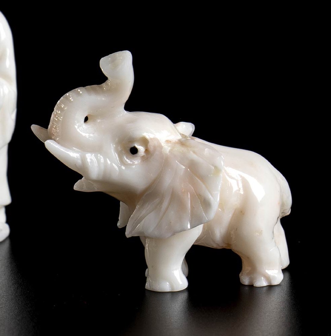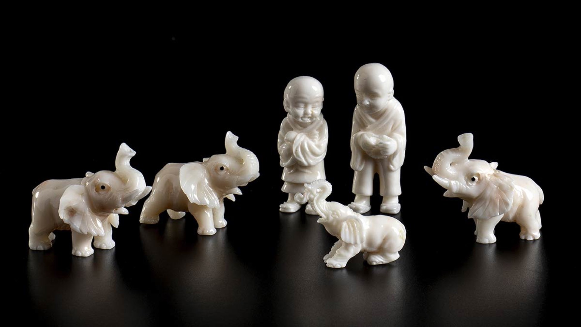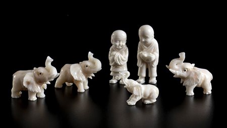 (corallium konjoi) raffiguranti 4 elefanti e 2 bambini. Dimensioni 3,5 x 4,5 x 2,1 cm; 3,6 x 4,7 x 2,1 cm; 3,3 x 4 x 2,2 cm; 2,7 x 3,7 x 1 cm; 4,7 x 1,7 x 1,5 cm; 4,7 x 1,4 x 1,2 cm. Peso complessivo 93,8 gr. Stato di conservazione: ***** eccellente.