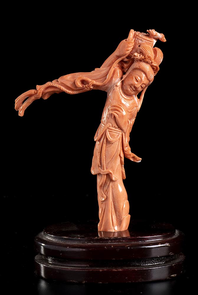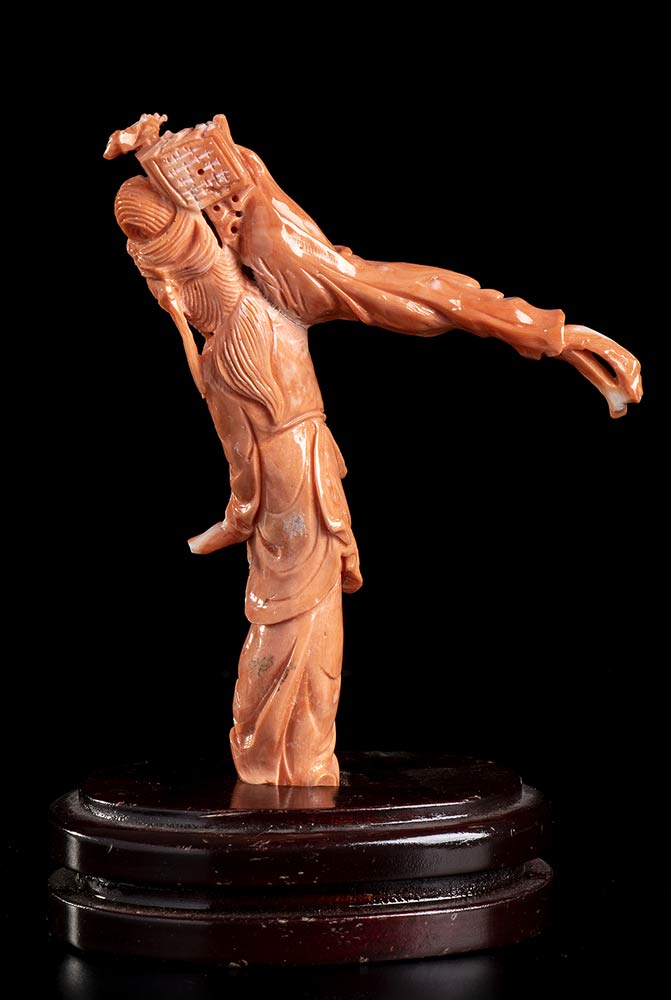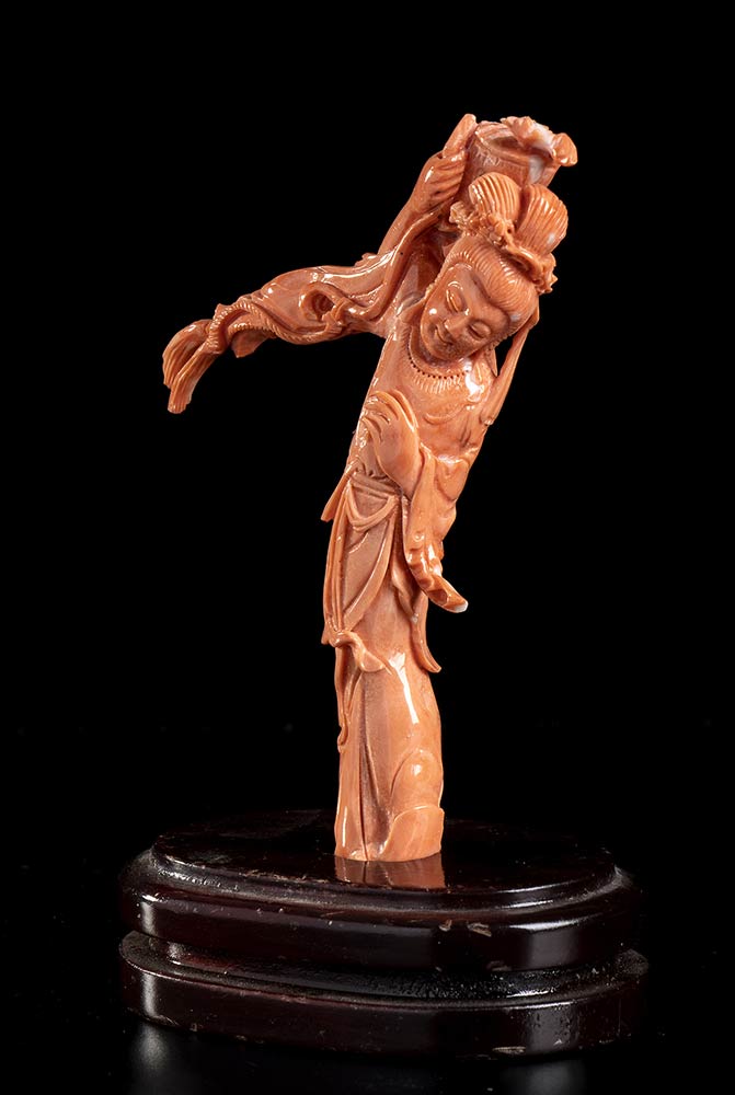(corallium elatius) raffigurante una Geisha posta sopra una base lignea. Dimensioni scultura 11,4 x 8 x 1,7 cm, base 2,2 x 7,8 x 5,5 cm. Peso scultura 57,5 gr. Stato di conservazione: ***** eccellente.
