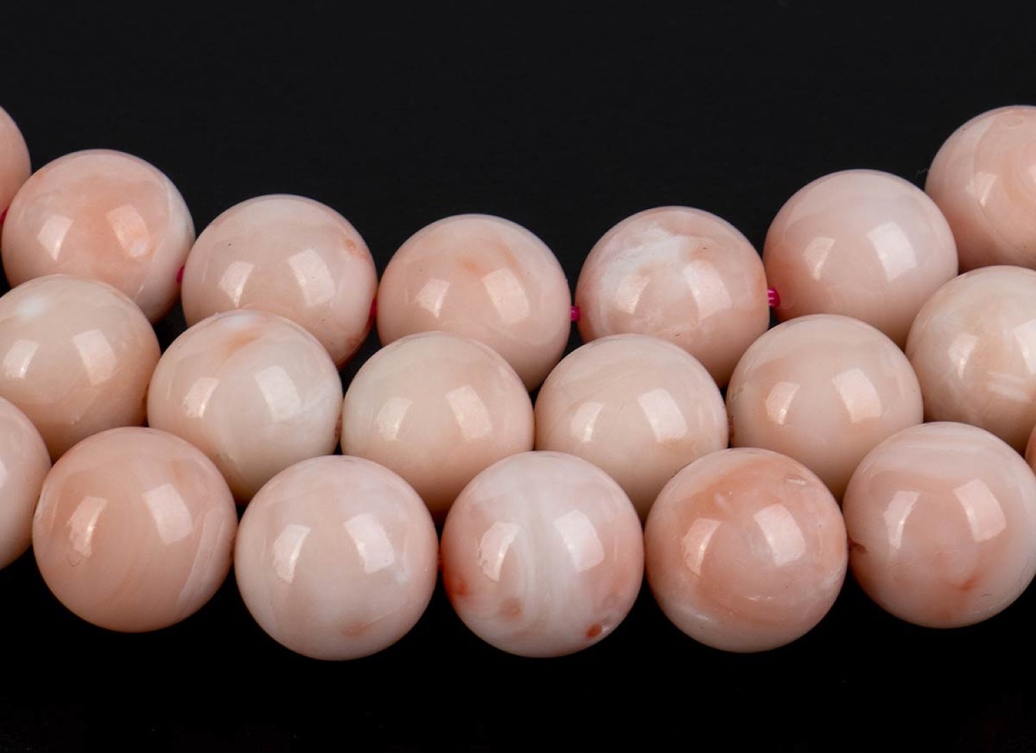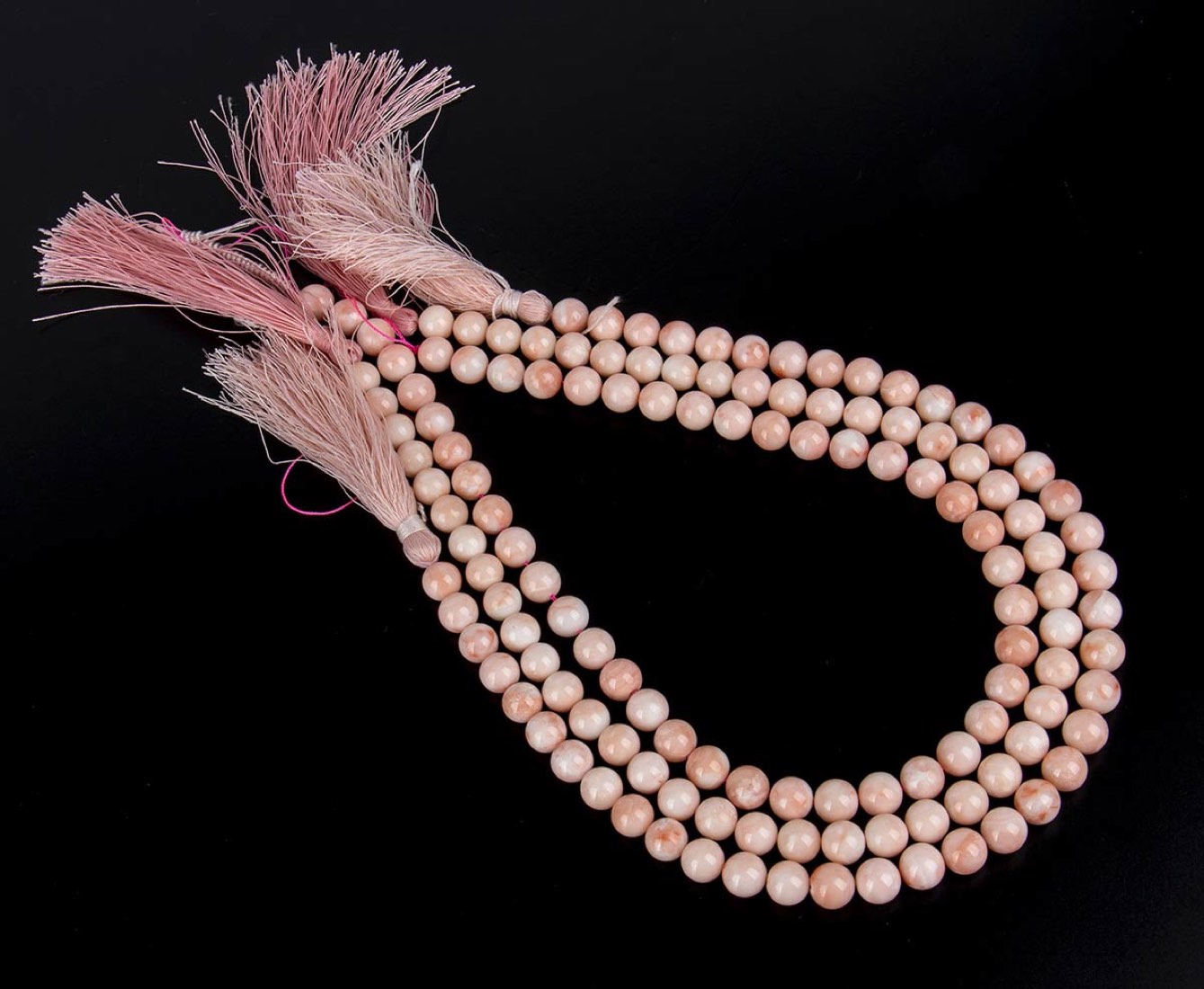 sfere in corallo Midway (corallium sp. nov.) disposte in gradazione. Lunghezze 47, 46 e 42 cm. Diametro 10,5-11 mm. Peso 212,9 gr. Stato di conservazione: ***** eccellente.