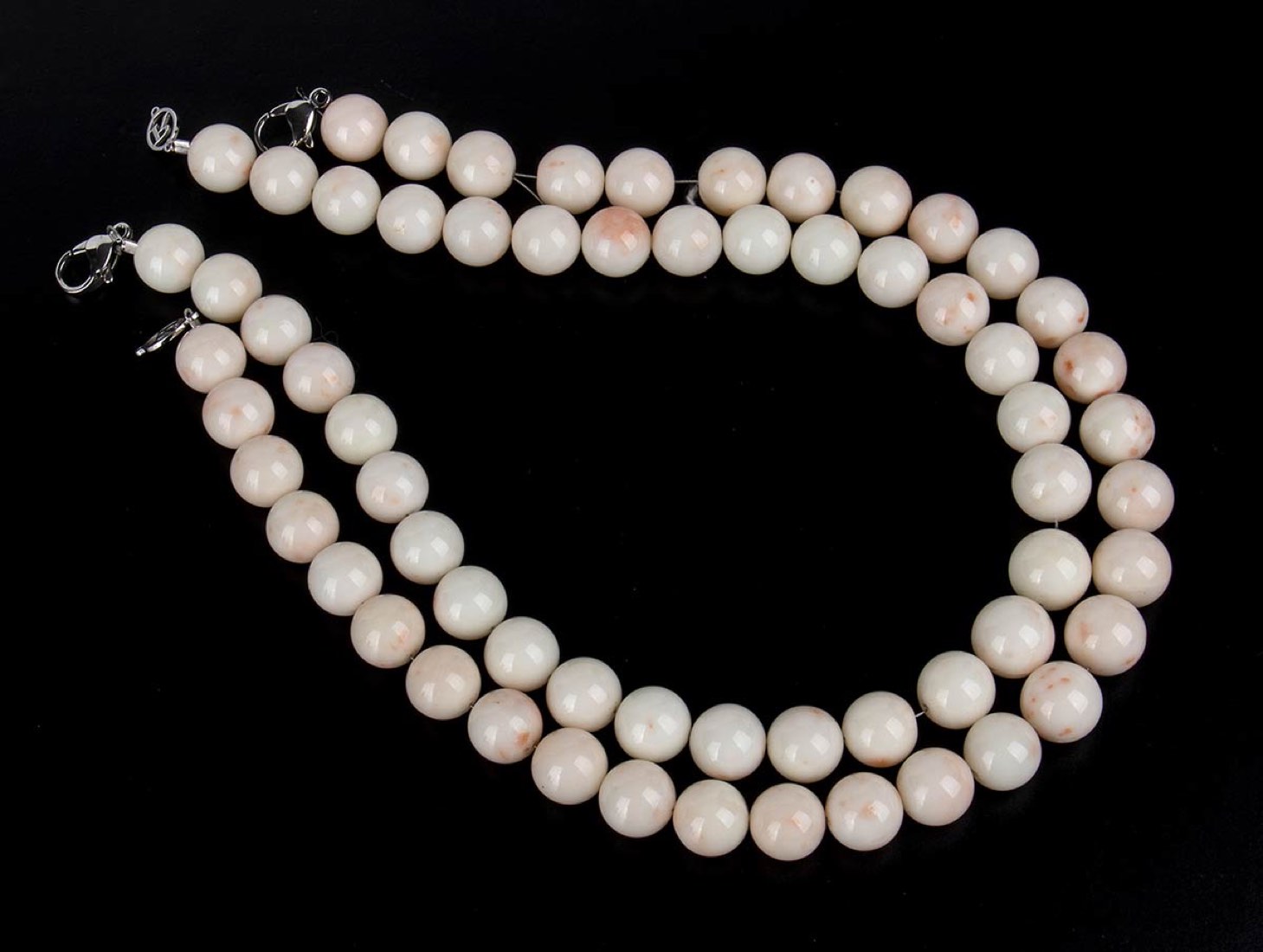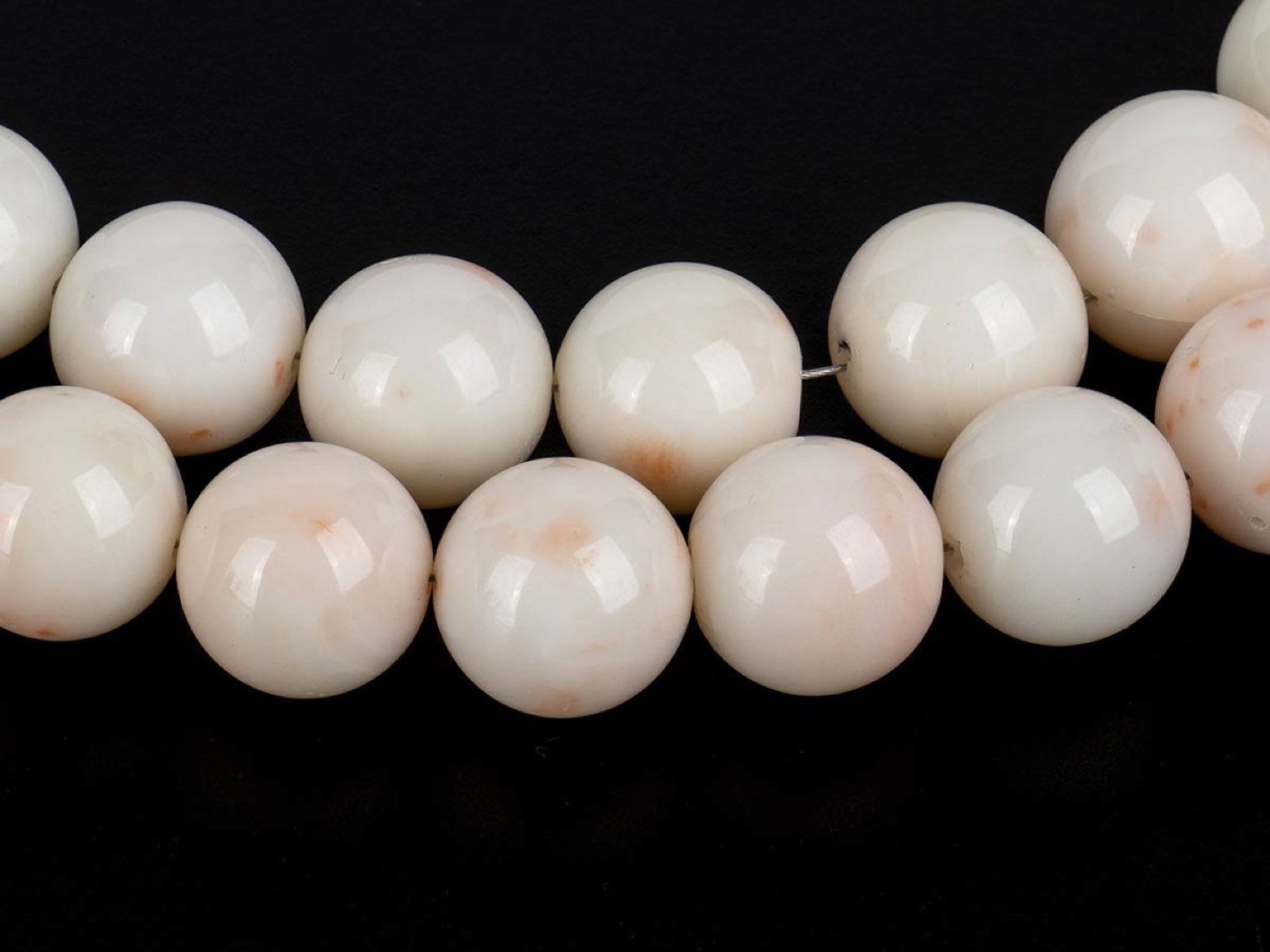 sfere in corallo rosa (corallium secundum) disposte in gradazione. Lunghezza 42 cm. Diametro 14-12,5 mm. Peso 191,2 gr. Stato di conservazione: ***** eccellente.