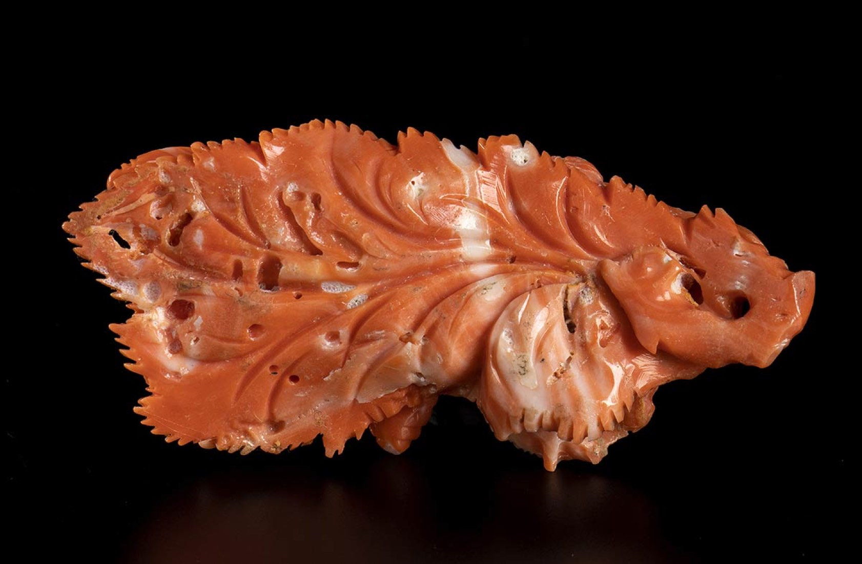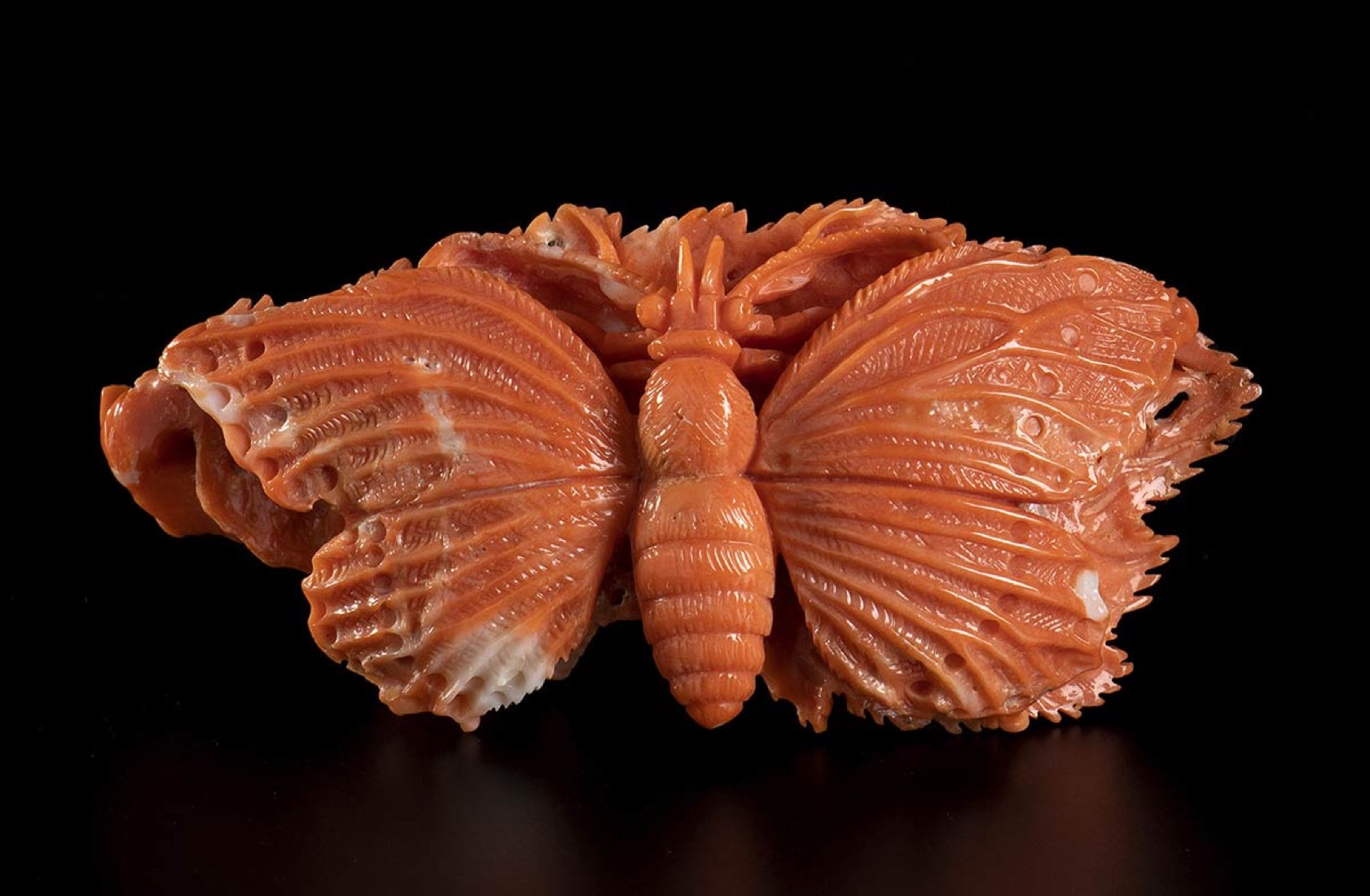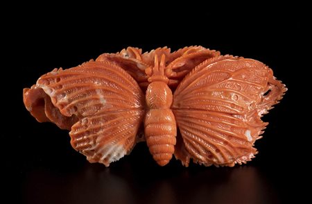 (corallium elatius) raffigurante una farfalla su una foglia. Dimensioni 2,2 x 8,4 x 3,8 cm. Peso 47,8 gr. Stato di conservazione: ***** eccellente.