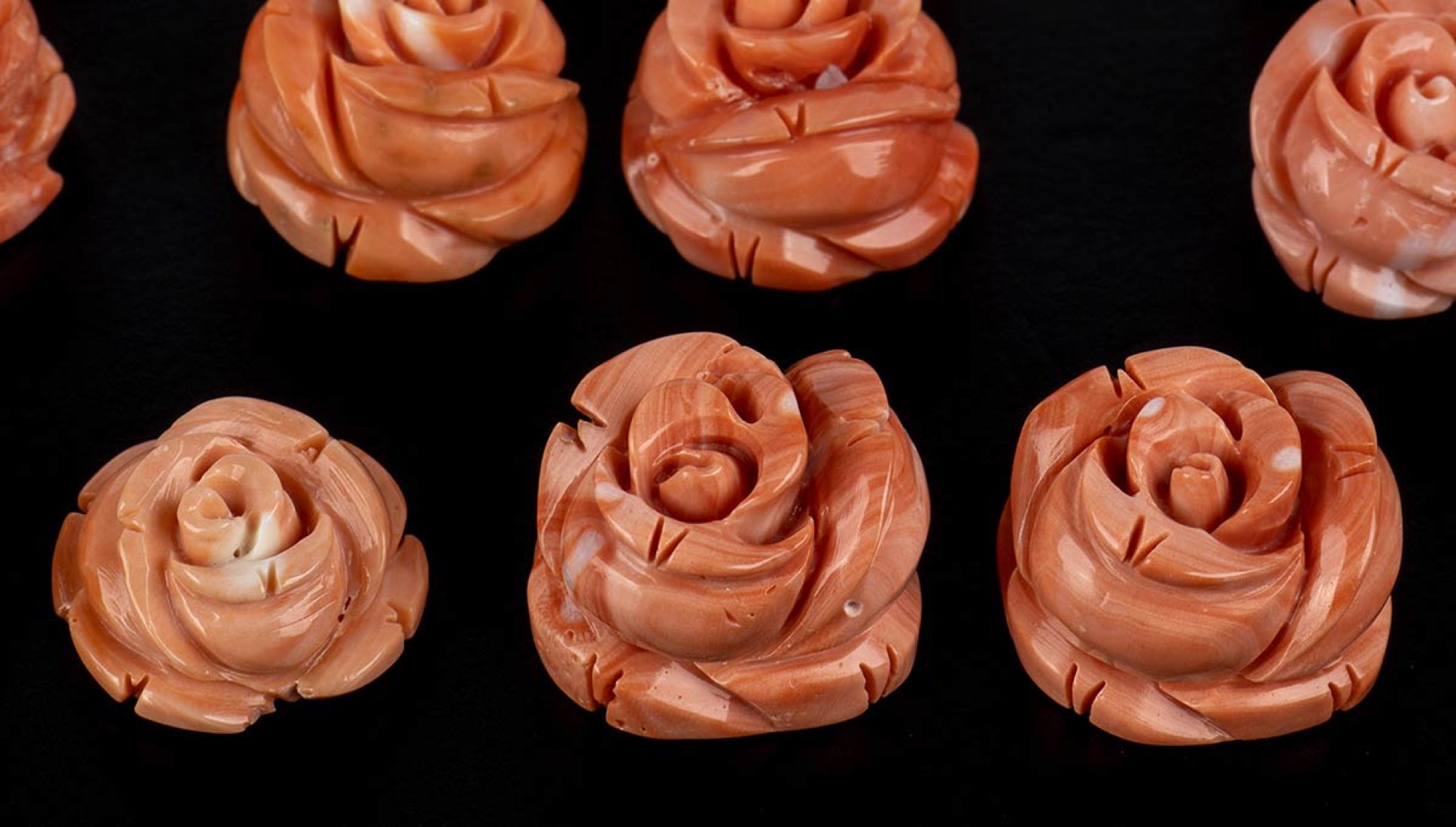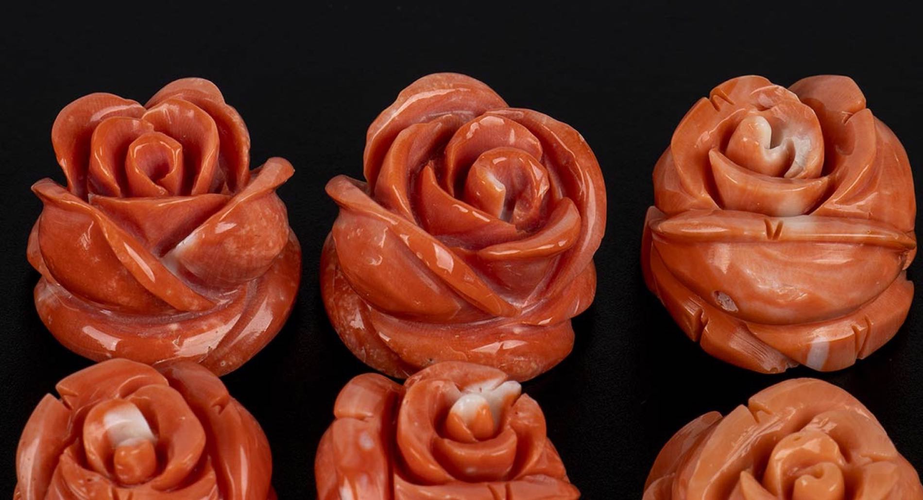 scolpite in corallo cerasuolo (corallium elatius). Diametri da 16 a 22 mm. Peso complessivo 400 gr. Stato di conservazione: ***** eccellente.