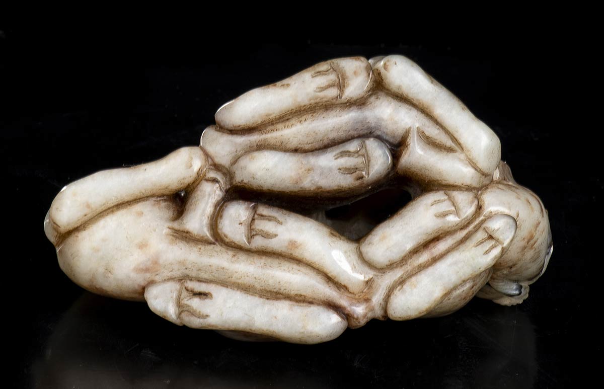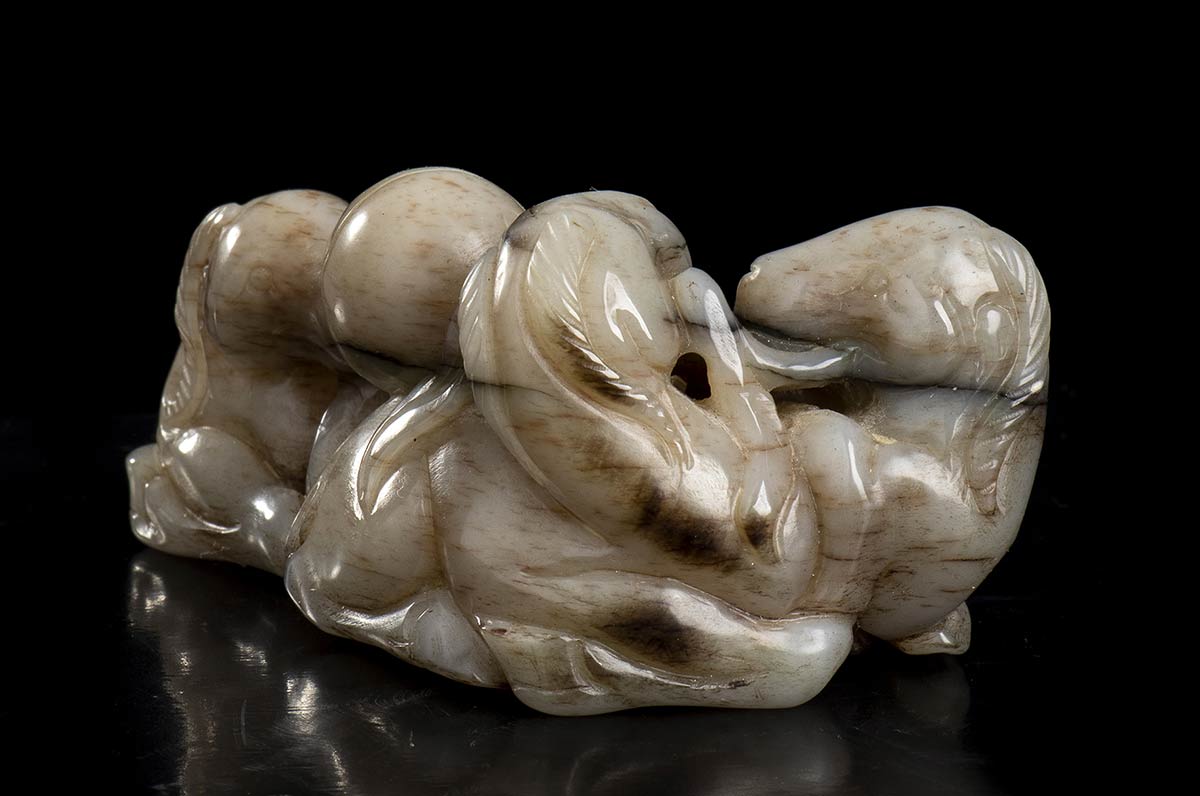 GRUPPO IN GIADA CREMA E MARRONE SCURO CON TRE ARIETI E FUNGHI LINGZHI Cina, XVII secolo