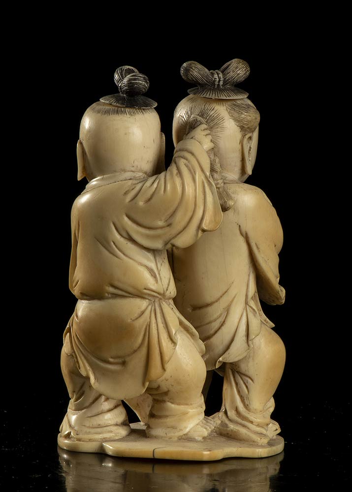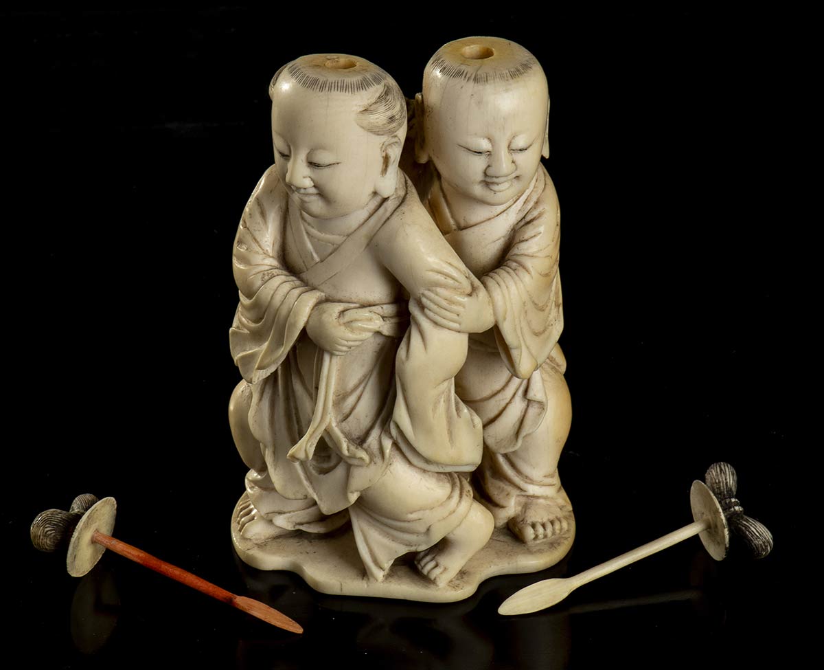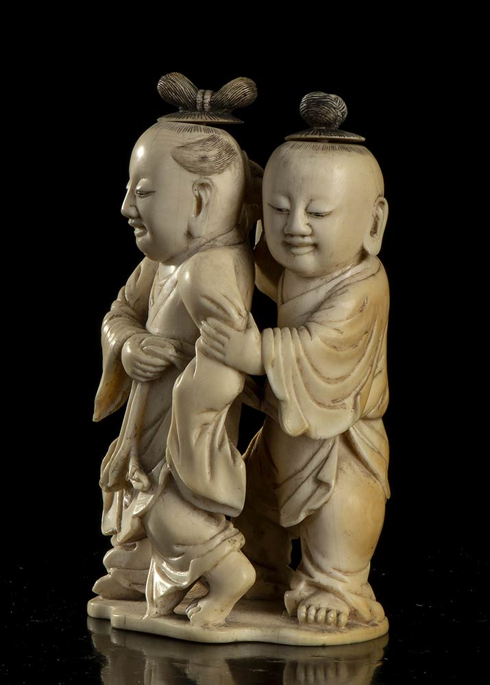 DOPPIA SNUFF BOTTLE IN AVORIO A FORMA DI DUE BAMBINI Cina, inizio del XX secolo