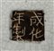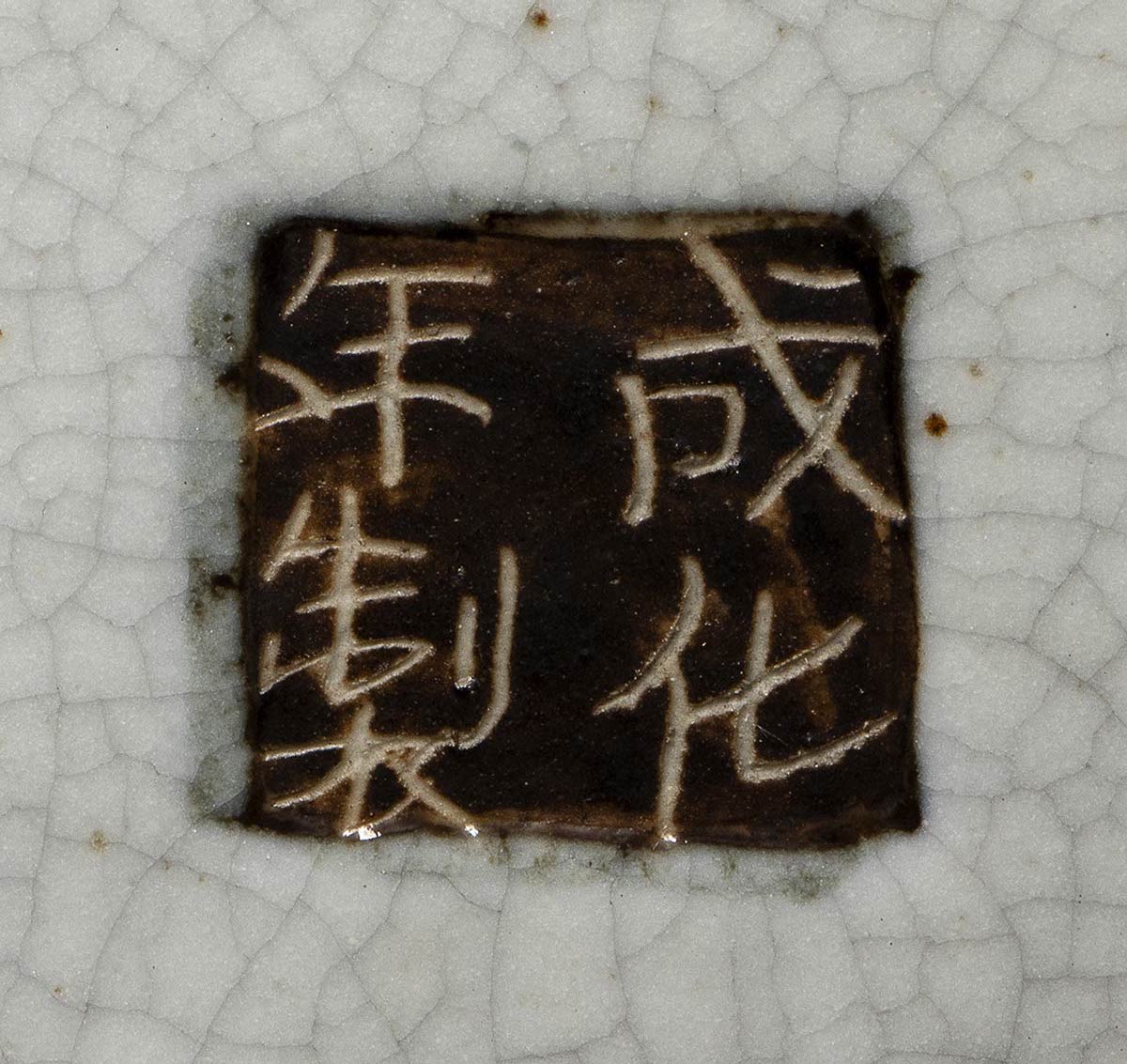 A sezione circolare, il bacile è rivestito di invetriatura trasparente con crettatura a maglie strette, sull'esterno nei pressi dell'orlo una fascia a biscuit con rilievo geometrico e verso la base con onde stilizzate, la decorazione in blu consiste di motivi floreali e uccelli, marchio apocrifo di Chenghua inciso in riquadro a biscuit al centro della base.