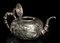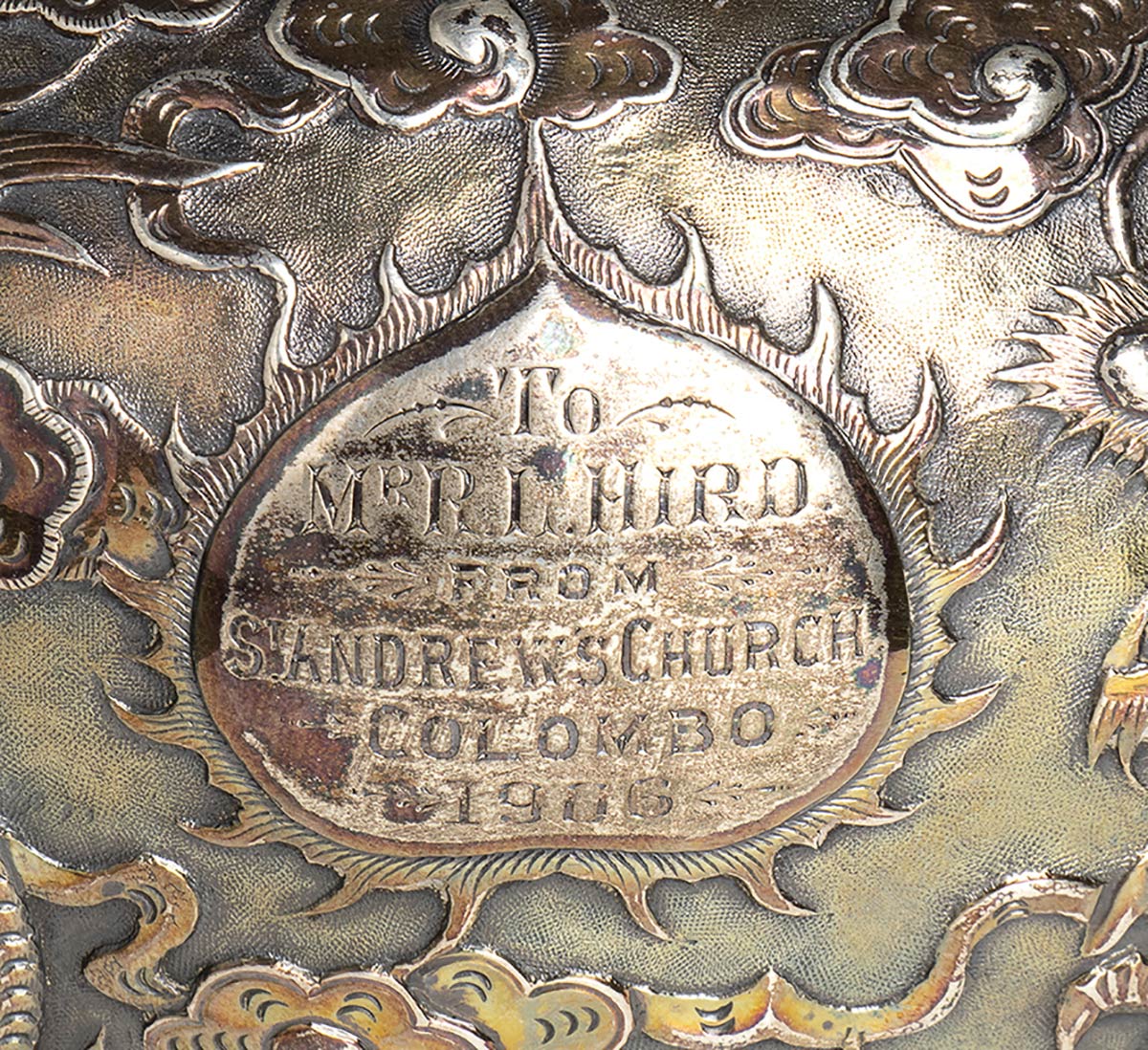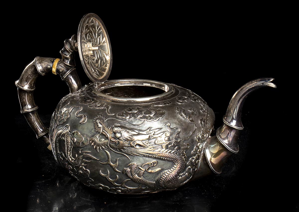 Sul corpo globulare stiacciato si svolge una decorazione a rilievo di drago in volo tra nuvole, la presa a orecchio, il beccuccio ricurvo e la presa del coperchio modellati come fusto di bambù, sul corpo entro riserva lobata l'iscrizione “To Mr. R.L. Hiro from St. Andrew's Church Colombo 1906”, al centro della base punzoni.