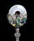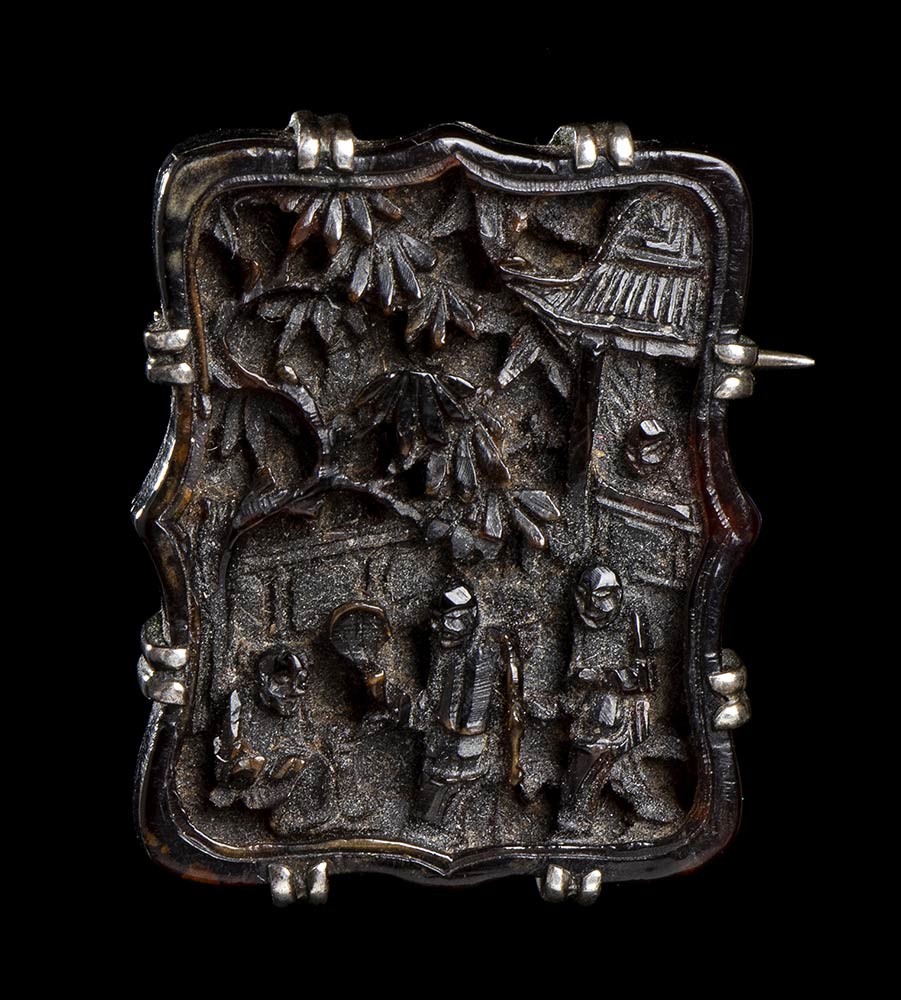 Lo spillone con decoro di farfalle a sostenere piccolo disco bi in pietra bianca; la spilla ornata sul davanti con scorcio di paesaggio con figure, sul retro etichetta di antica collezione.