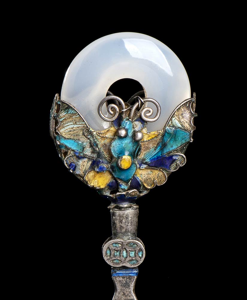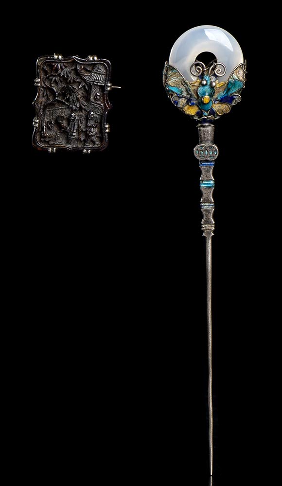 SPILLONE DA CAPELLI IN ARGENTO SMALTATO CON PIETRA E SPILLA IN CORNO Cina, inizio del XX secolo