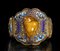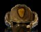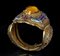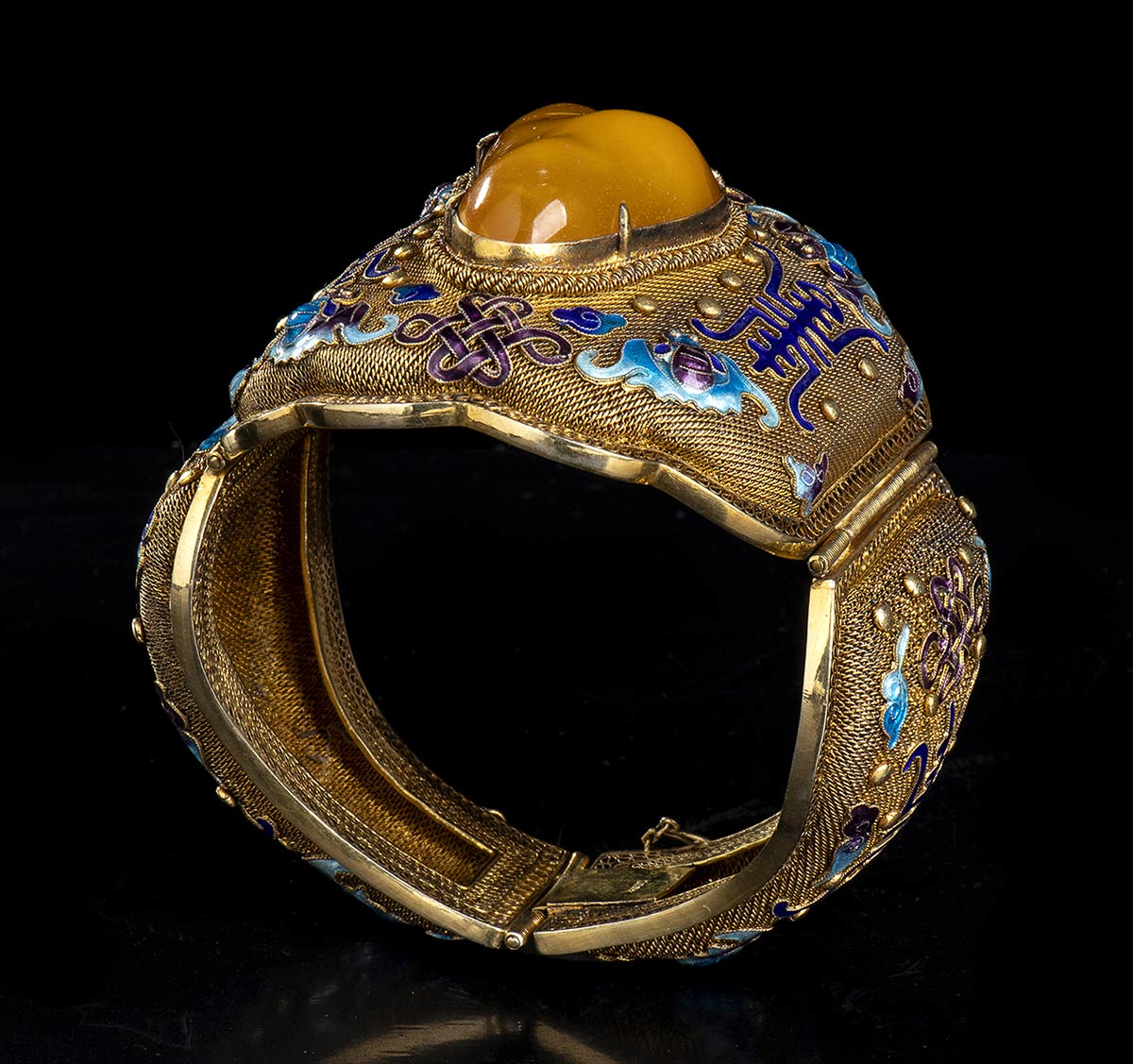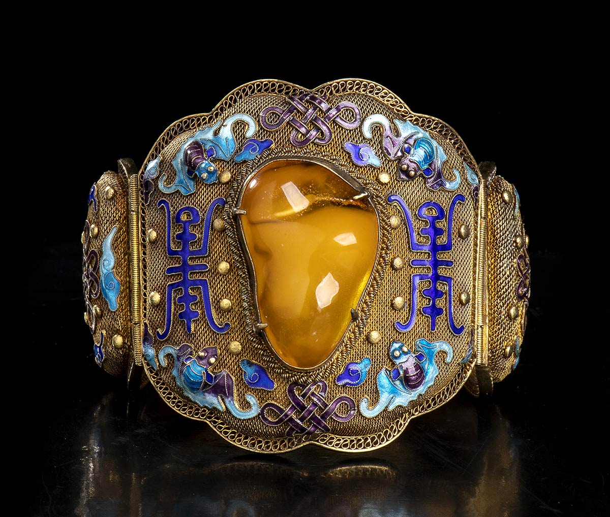 Finemente lavorato a filigrana, ha decoro a smalti policromi di pipistrelli in volo tra nuvole stilizzate, caratteri shou e il motivo del nodo infinito, al centro del lato superiore un ciottolo di ambra gialla.