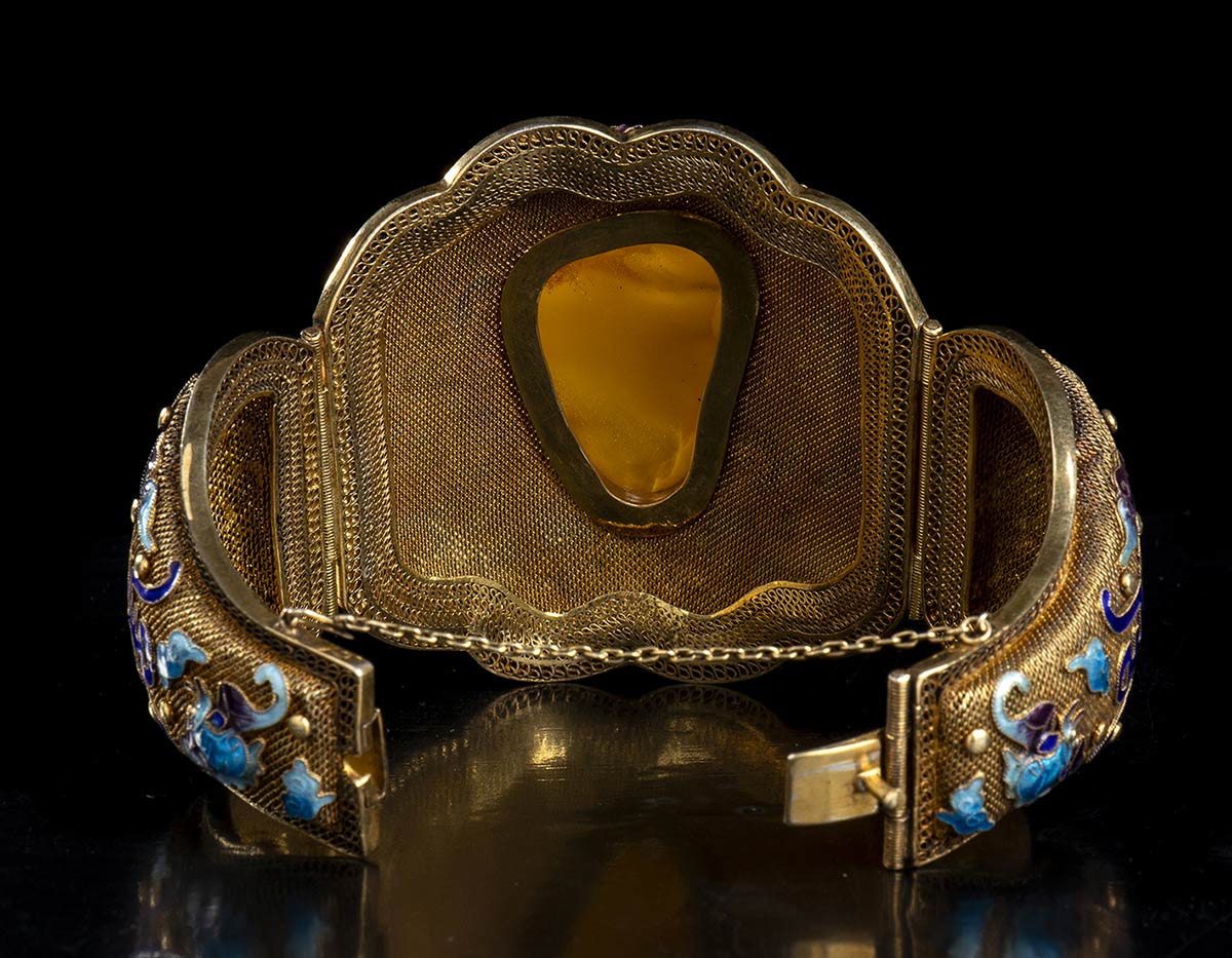 BRACCIALETTO IN ARGENTO PARZIALMENTE SMALTATO CON INSERTO IN AMBRA Cina, inizio del XX secolo