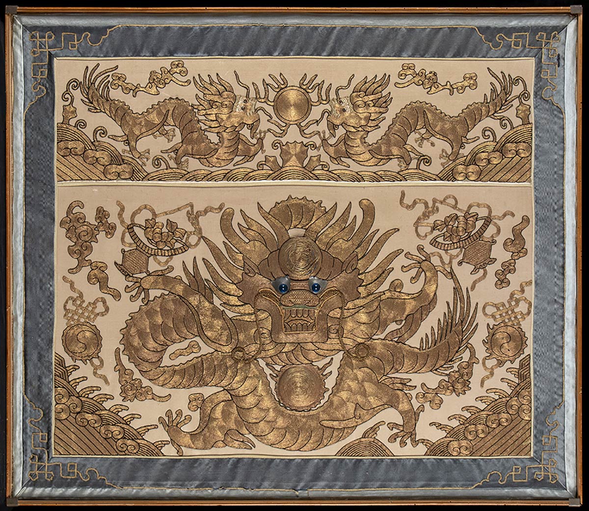 GRANDE PANNELLO IN SETA CON RICAMO DI DRAGHI