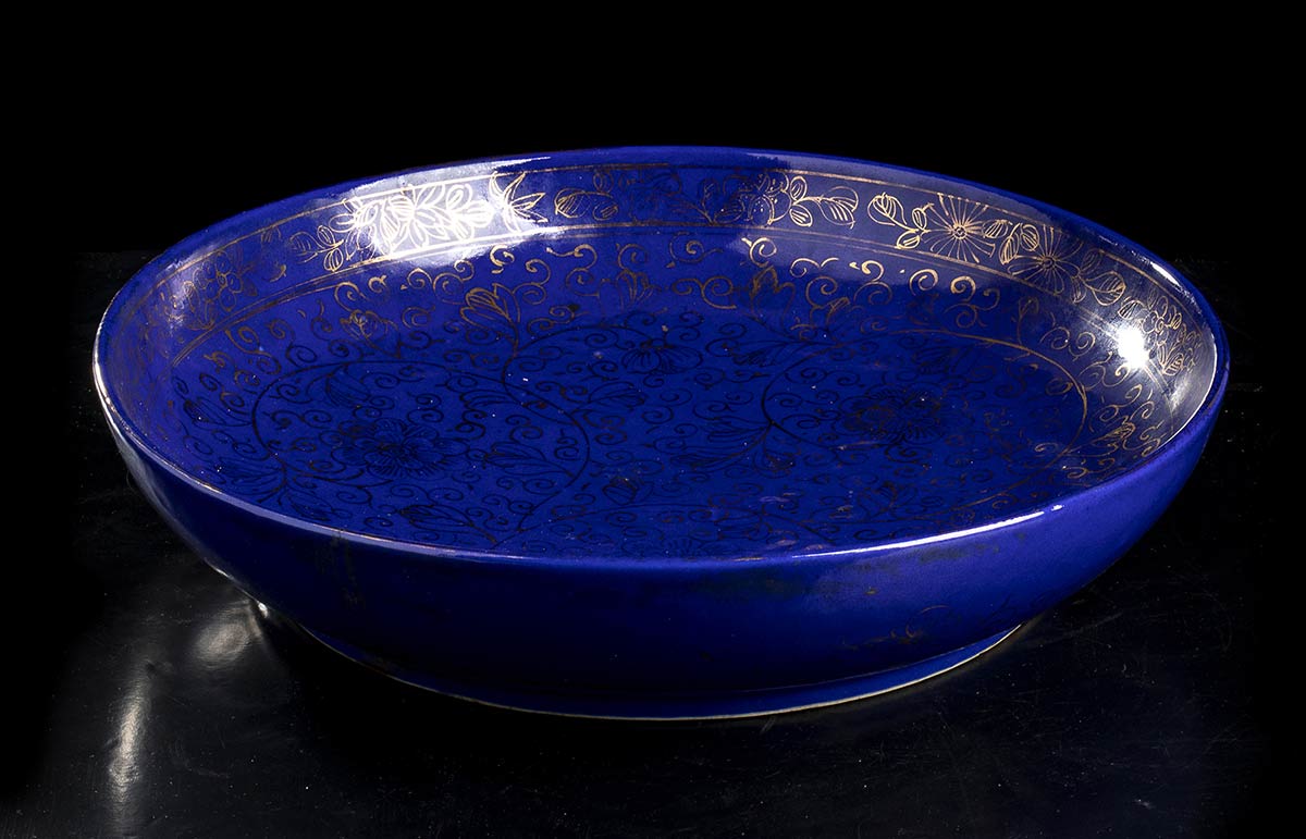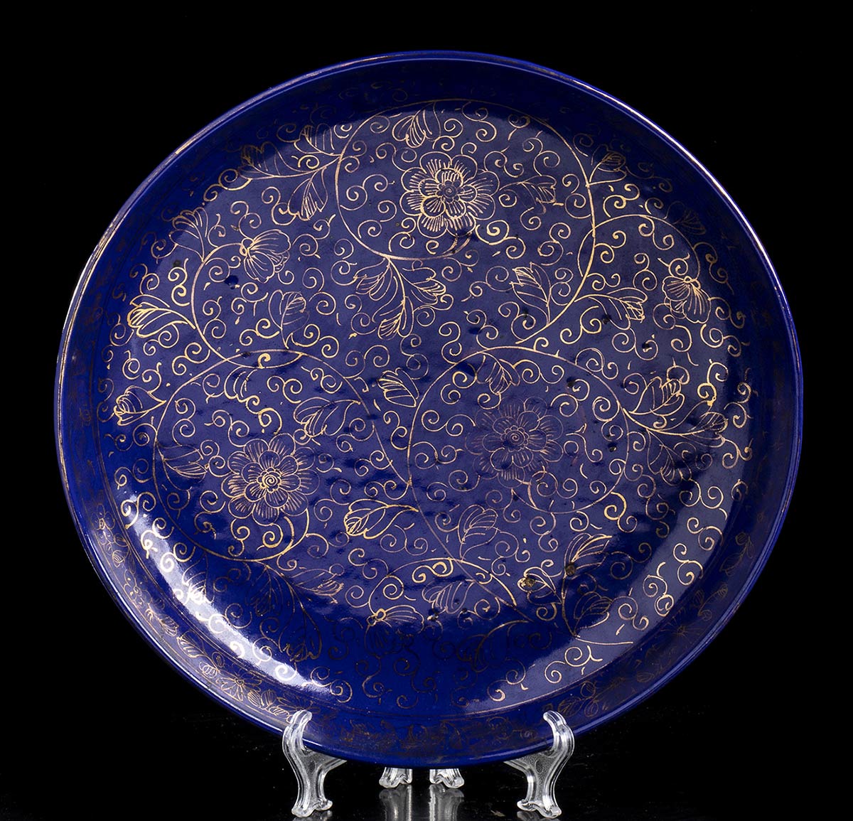 PIATTO IN PORCELLANA CON INVETRIATURA BLU E DECORO A ORO Cina, dinastia Qing, marchio e periodo Yongzheng