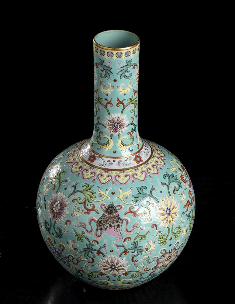A sezione circolare con corpo globulare sul quale si innesta lungo collo cilindrico, la superficie esterna dipinta a smalti policromi di consistenza tattile e stesure dorate con un decoro di fiori di loto stilizzati tra i quali si inseriscono gli Otto Emblemi Buddhisti, verso la base una banda con foglie stilizzate appaiate, sulla spalla una fascia con teste di scettro ruyi, marchio apocrifo di Qianlong al centro della base.