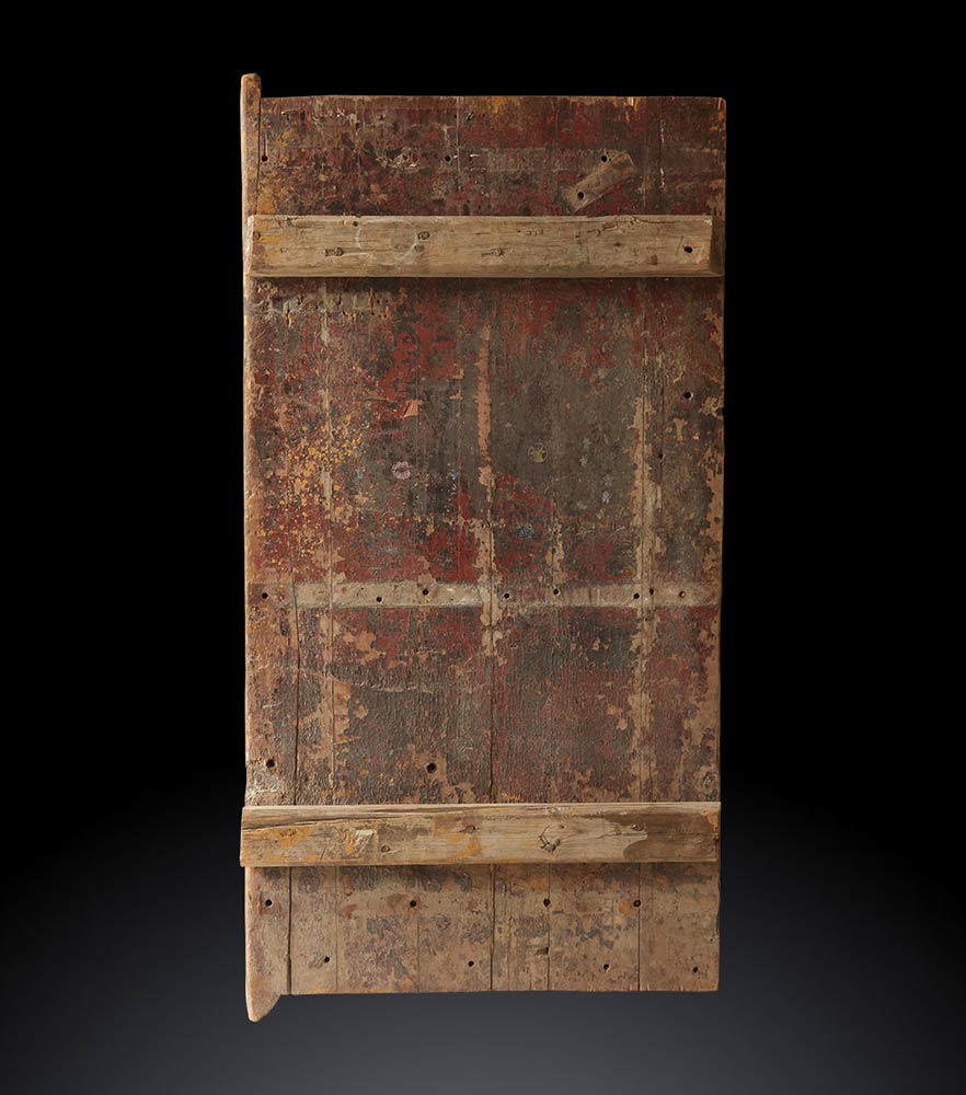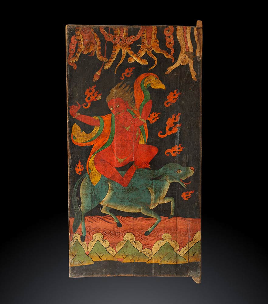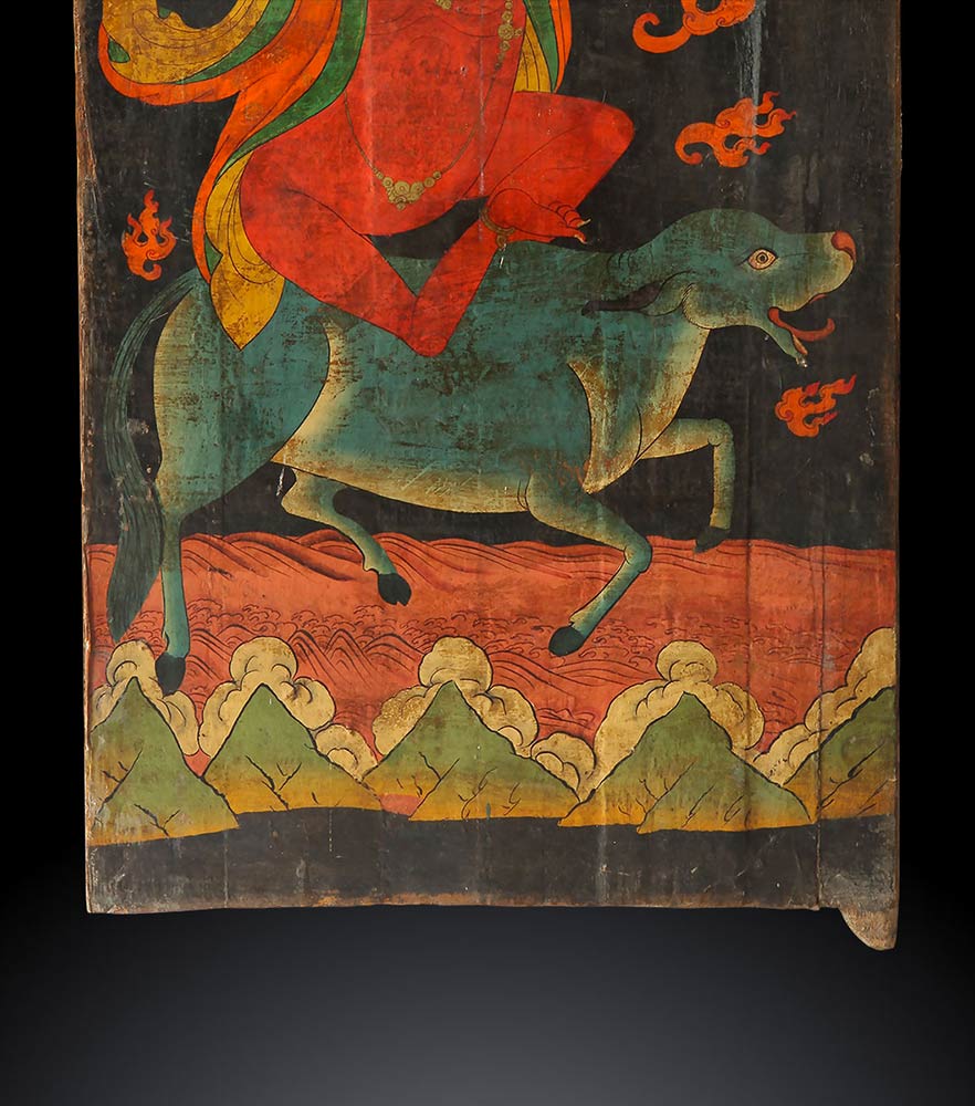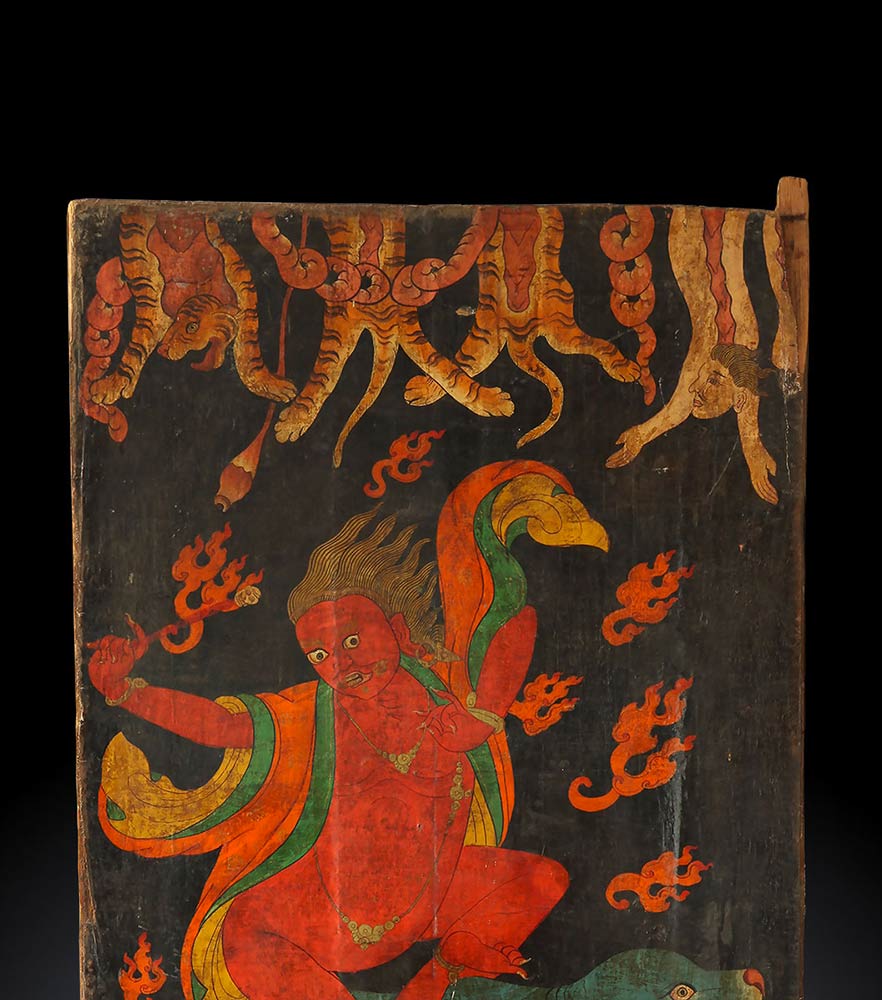 DIPINTO A COLORI SU TELA INCOLLATA SU UNA PORTA IN LEGNO CON DAKINI Tibet, XVIII-XIX secolo