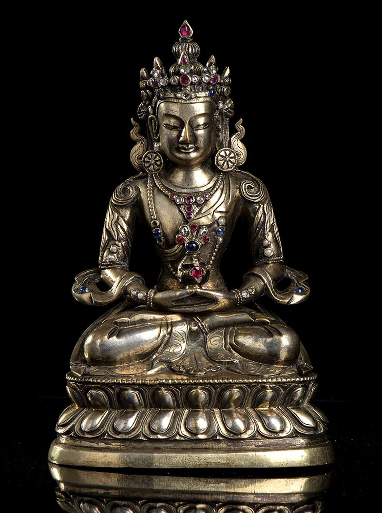 AMITAYUS IN LEGA DI RAME CON INTARSI IN PIETRE Sino-tibetano, XVIII-XIX secolo