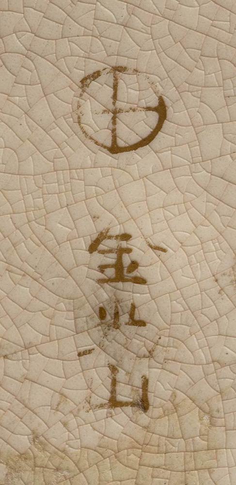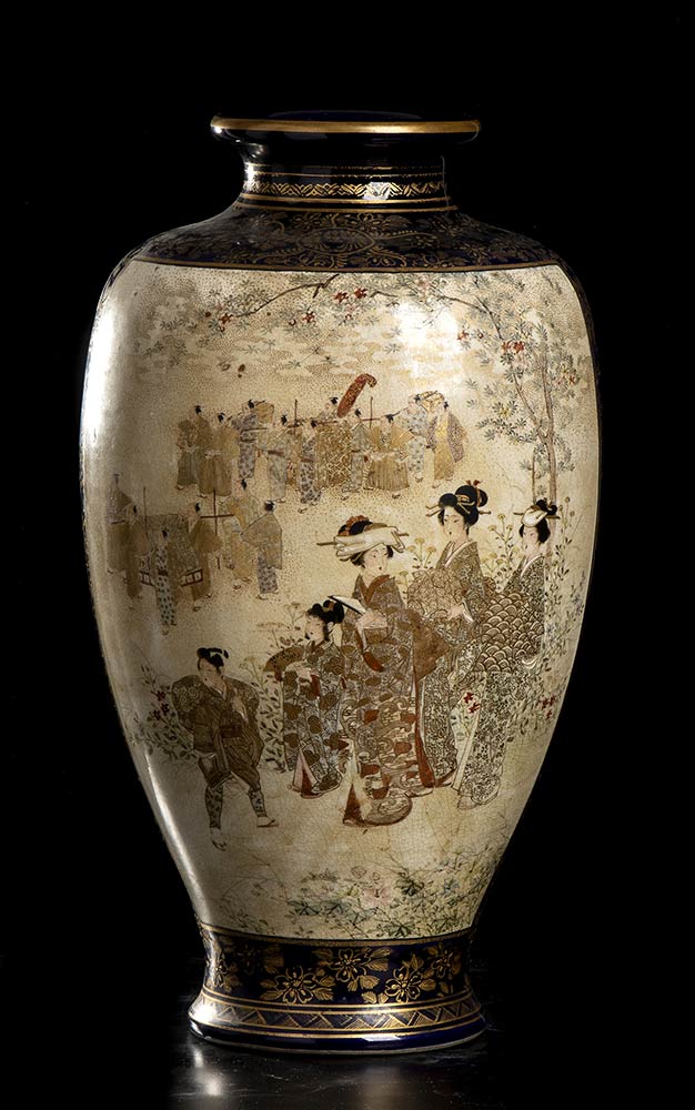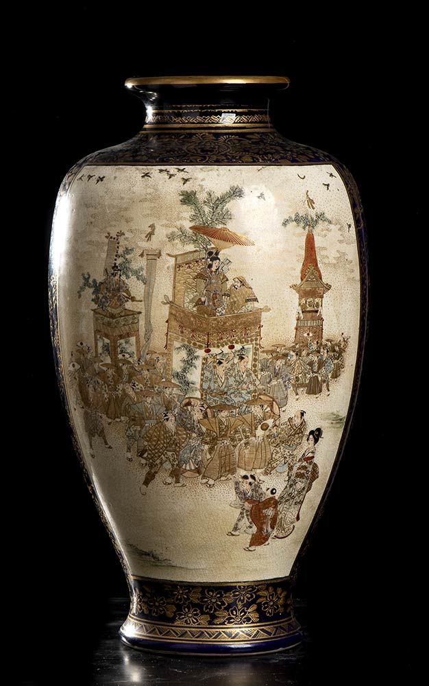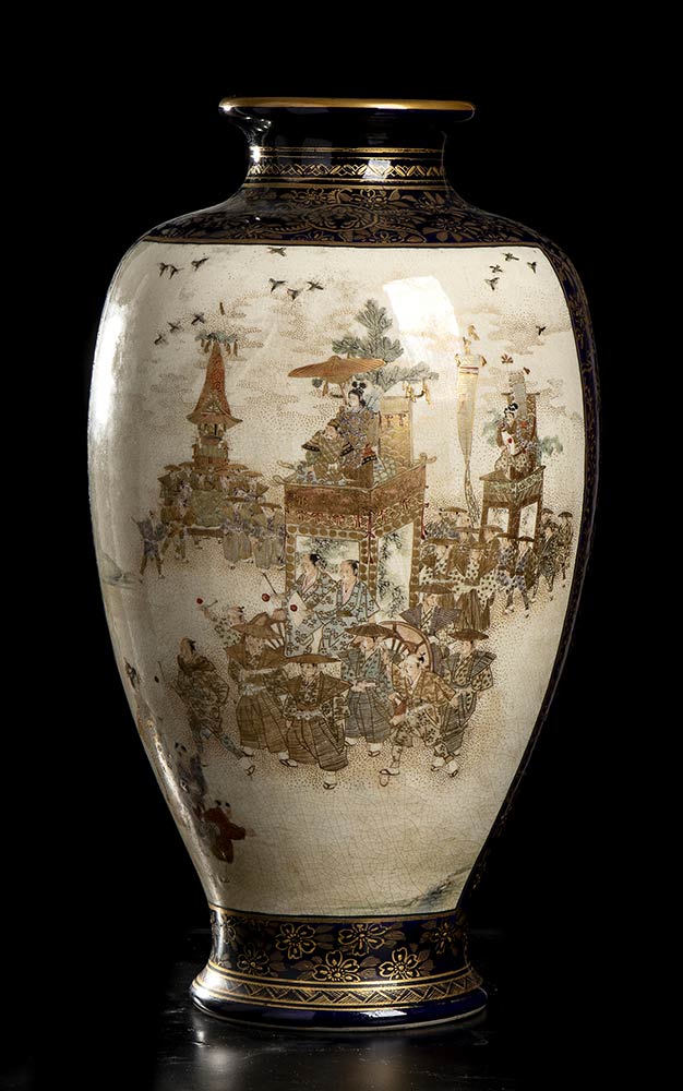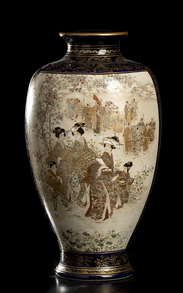 A sezione circolare, con base ad anello, ampio corpo ovoidale, breve collo cilindrico e bocca espansa, presentano un fondo blu con decoro floreale a oro sul quale si stagliano grandi riserve con scene ambientate nel paesaggio e affollate di figure, marchio 金光山 (Kinkōzan) con emblema Shimazu al centro della base di entrambi.