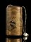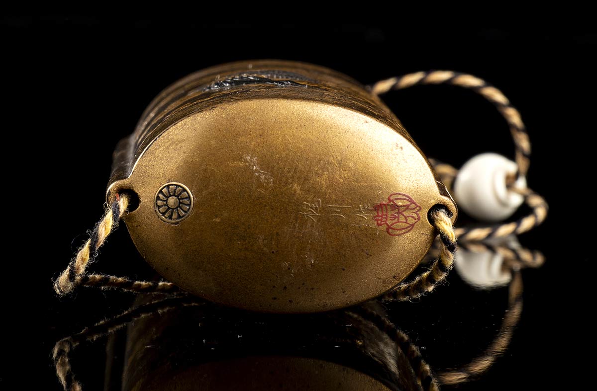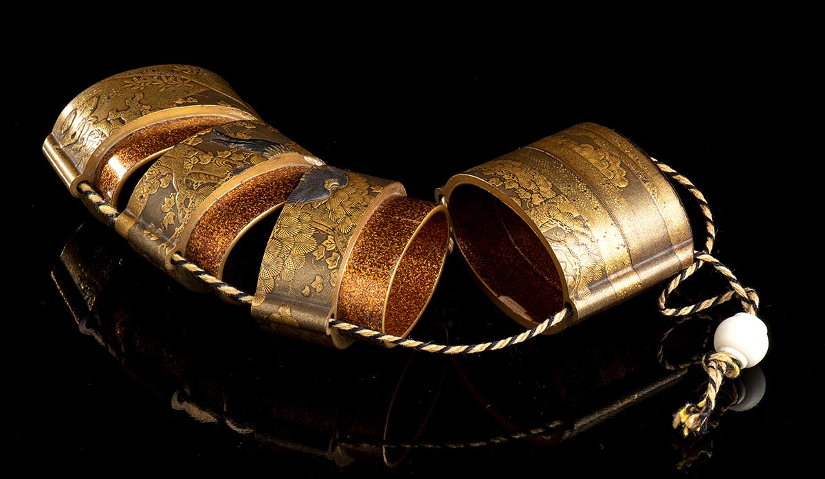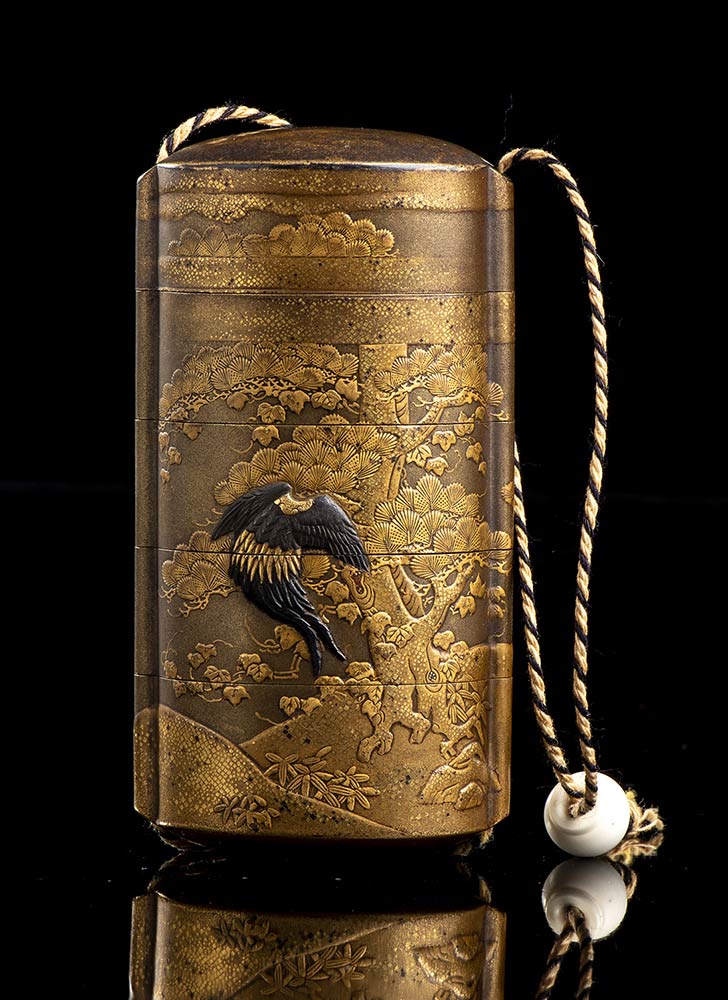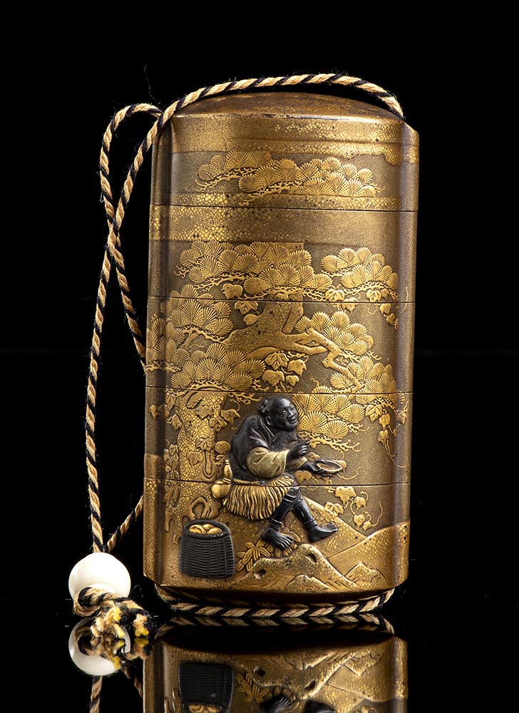 A quattro scompartimenti, finemente decorato in hiramaki-e e kirikane con una scena continua di paesaggio con alberi di pino e una figura seduta nei pressi di una cesta, firmato a oro 梶川作 (Kajikawa saku, “Fatto da Kajikawa”) con kaō a smalto rosso a forma di vaso stilizzato.