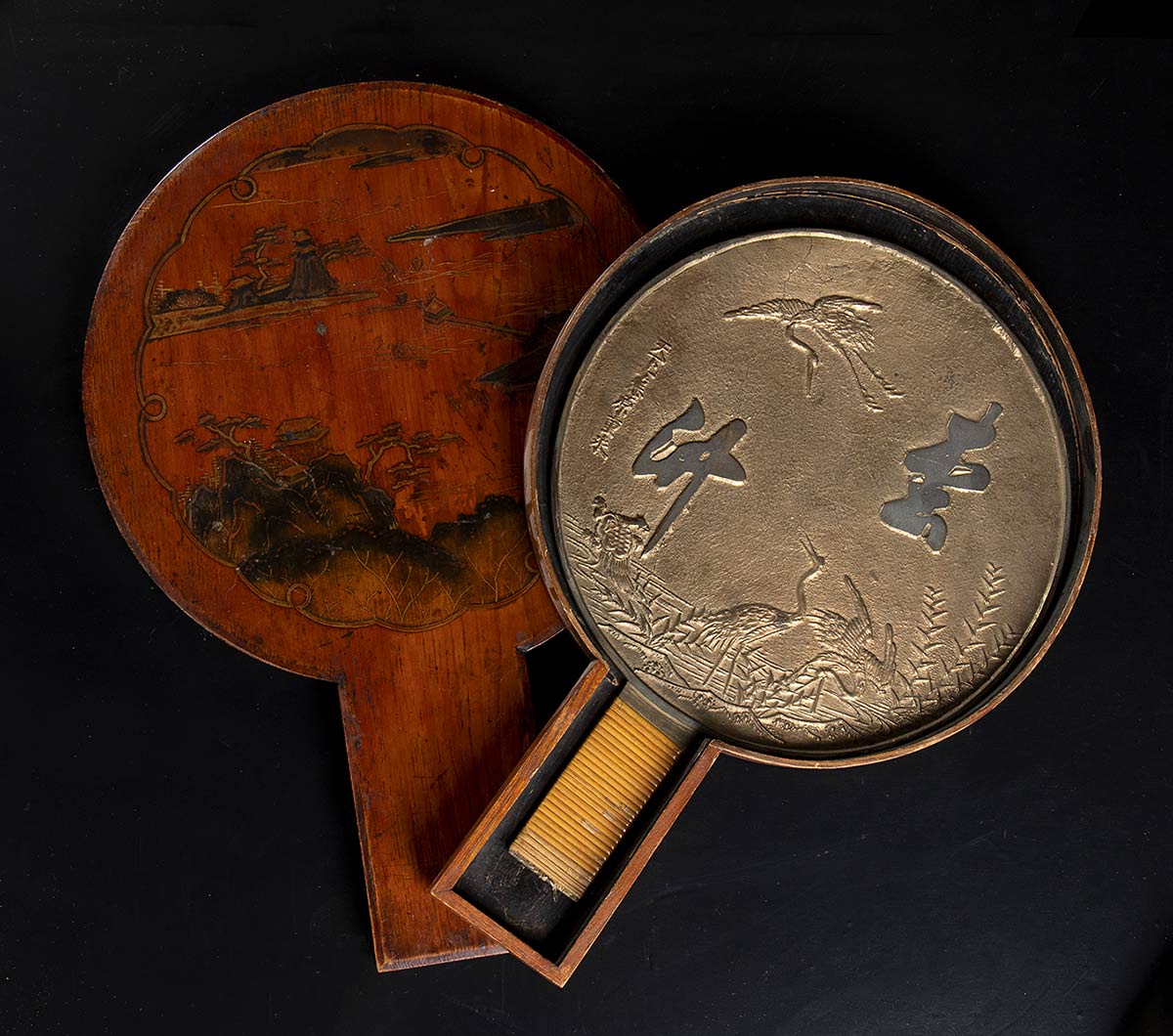 SPECCHIO IN BRONZO CON SUA CUSTODIA IN LEGNO LACCATO, E-KAGAMI Giappone, periodo Meiji
