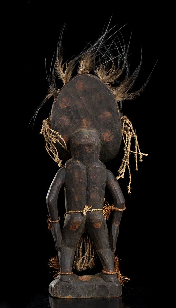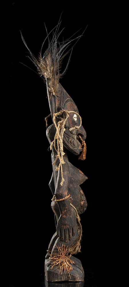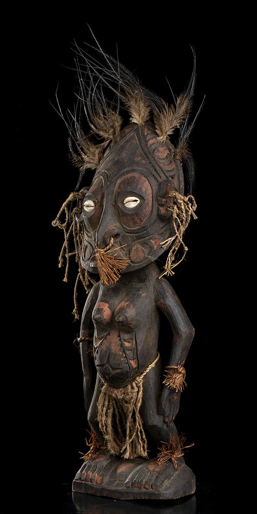 SCULTURA ANTROPOMORFA IN LEGNO, PENNE, CAURI E FIBRA VEGETALE Papua Nuova Guinea, Sepik