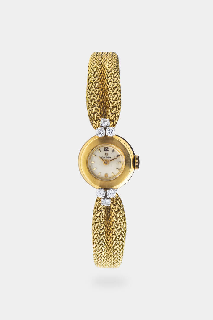 Cassa in oro giallo con fondello a pressione. Quadrante argento con indici geometrici applicati. Bracciale in oro marchiato Omega integrato con chiusura a scomparsa.