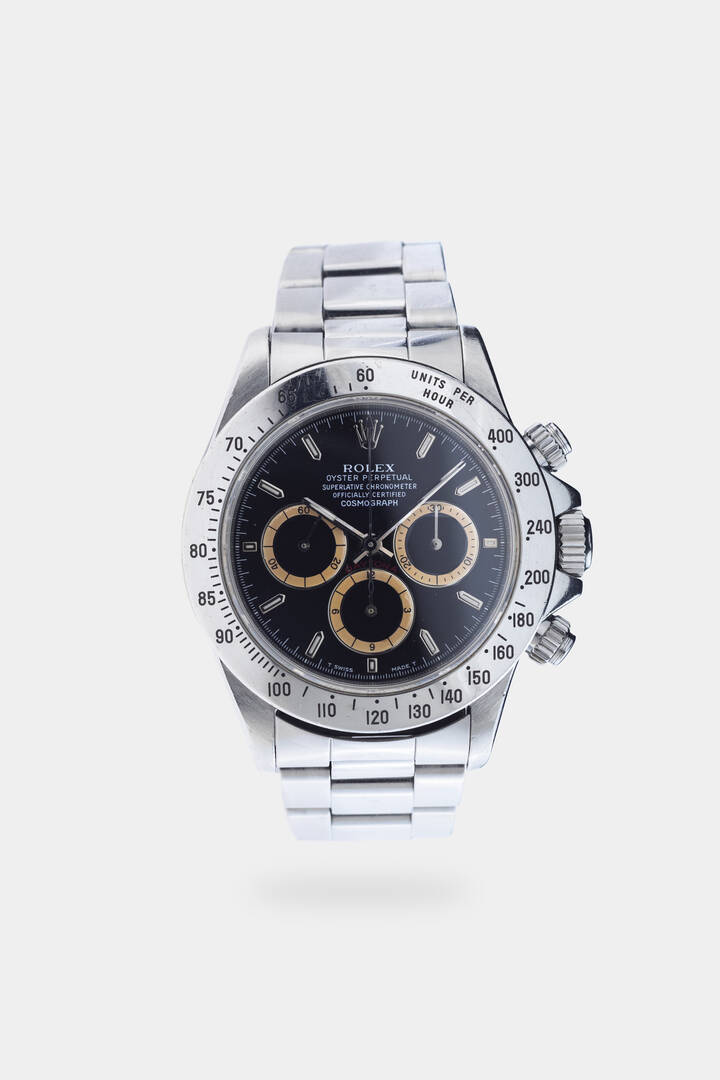 Cassa in acciaio con fondello a vite e pulsanti della cronografia a vite. Lunetta tachimetrica base 400. Quadrante nero di estrema rarità definito “Patrizzi dial” grazie al viraggio cromatico dei contatori che da colore bianco sono diventati color nocciola scuro quasi ocra. Ad ore 3 presente il contatore dei minuti, alle 6 quello delle ore ed alle 9 quello dei secondi continui. Bracciale originale “Oyster” di 12 maglie ref.78390.
