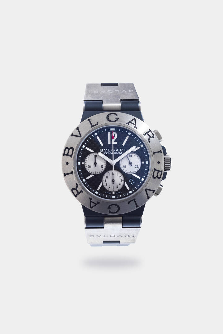 Cassa in polimero e titanio con lunetta recante incisa la scritta "Bulgari". Quadrante in carbonio con indici geometrici serigrafati, contatore dei secondi continui al 3, delle 12 ore al 6 e dei 30 minuti al 9.