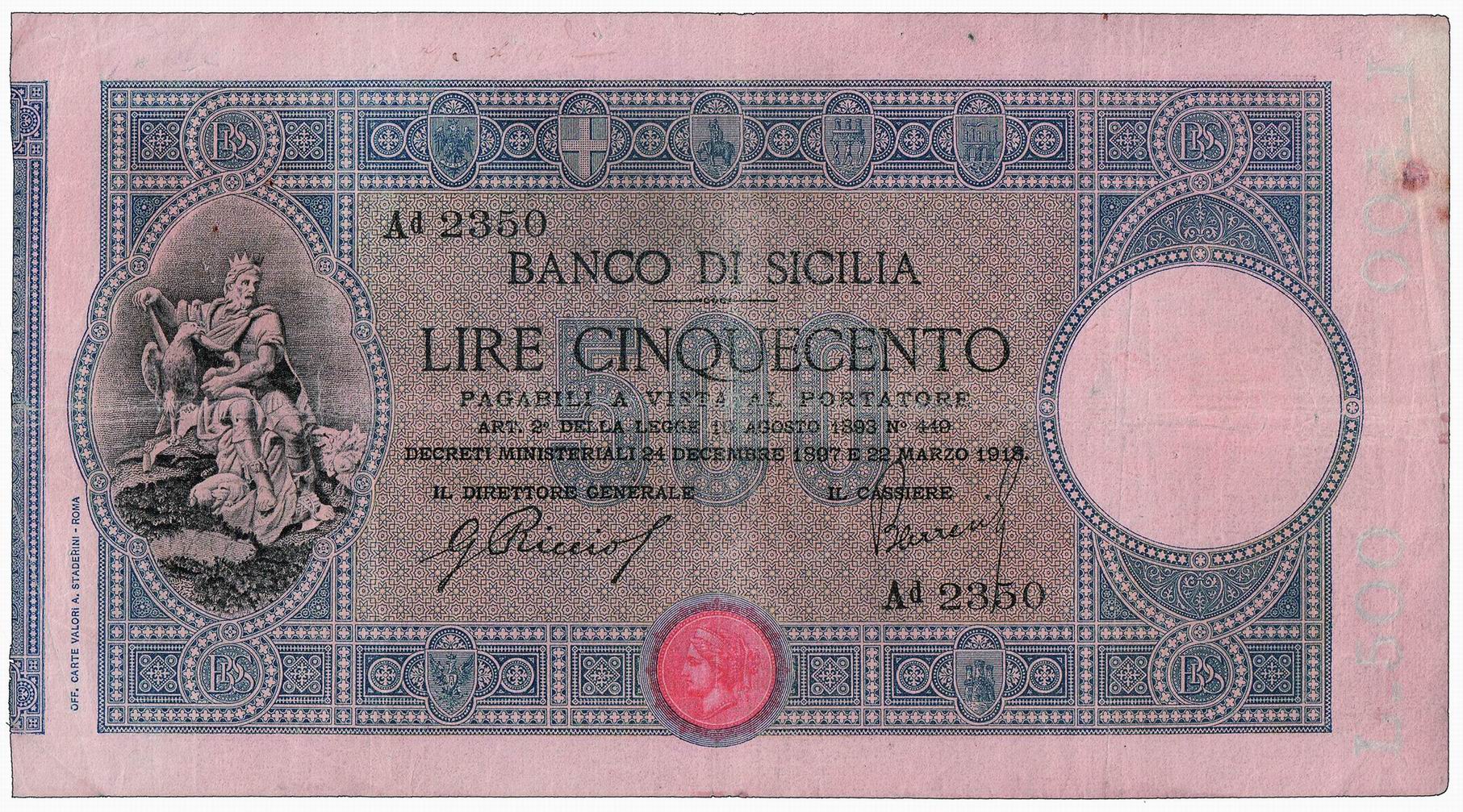 BANCO DI SICILIA - 500 Lire - Ad 2350 del 22/03/1918 - Certificato Subalpina. RRR BB+