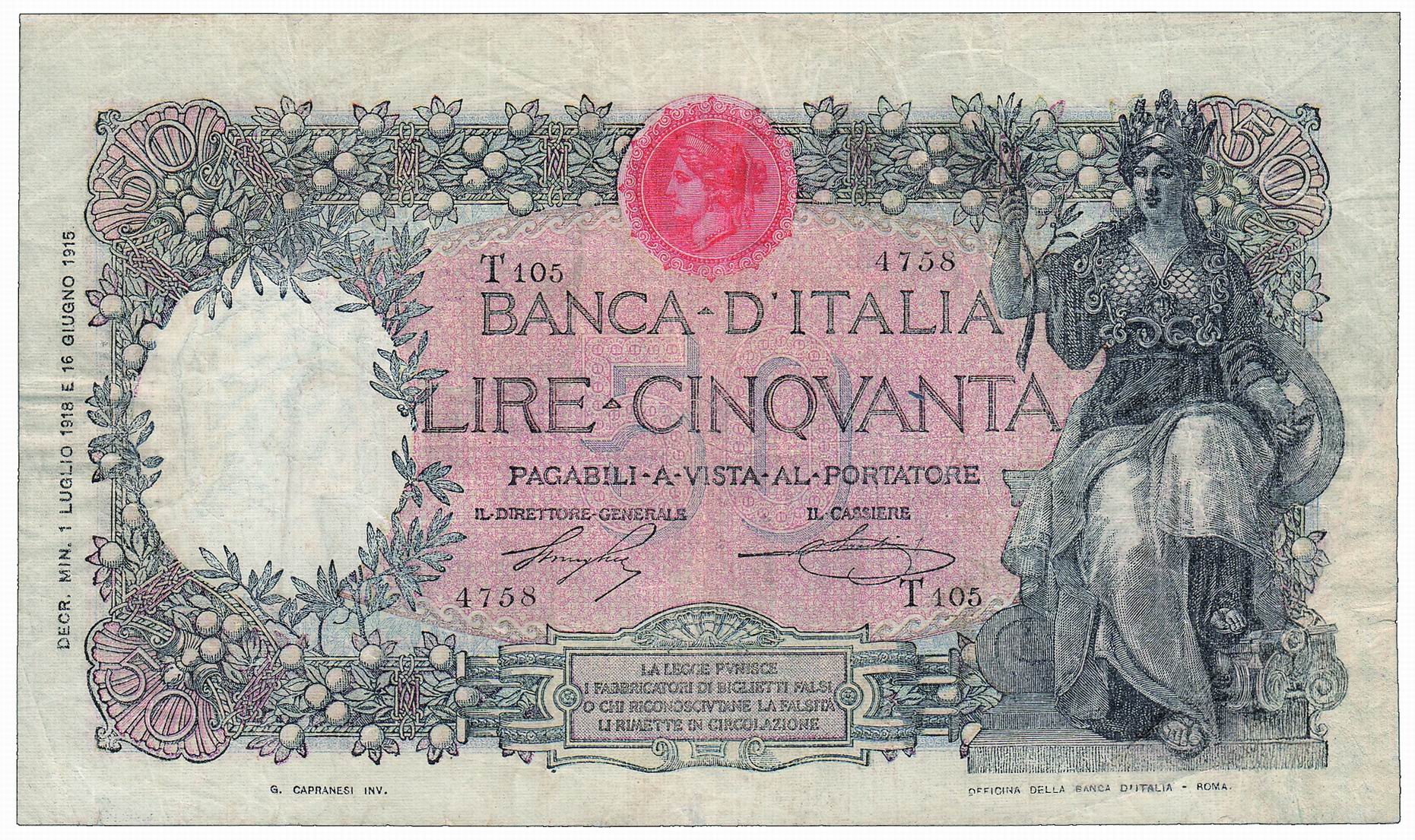 Lot 1034 | Cartamoneta - VITTORIO EMANUELE III - 50 Lire Buoi - 01 luglio 1918 - Qualche restauro, ma nel complesso molto bello.